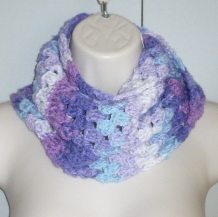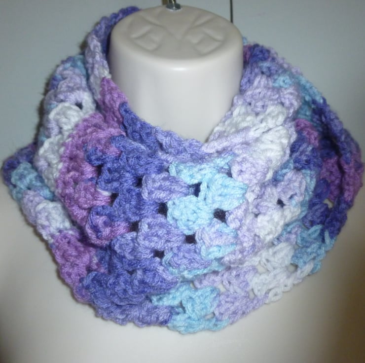 this pretty hand crocheted infinity scarf has been created using quality random dyed acrylic Aran yarn.