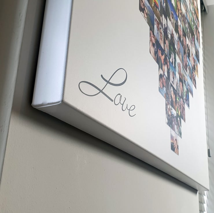 Photos are carefully arranged into a heart-shape and the canvas can be personalised with text on the front and or sides. Each photo is individually treated to get the best quality in terms of colour, tone and brightness.