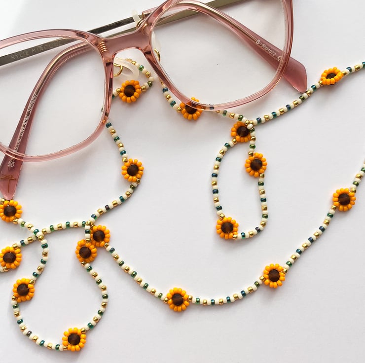 Bring a little sunshine to your everyday with this handmade sunflower beaded glasses chain.