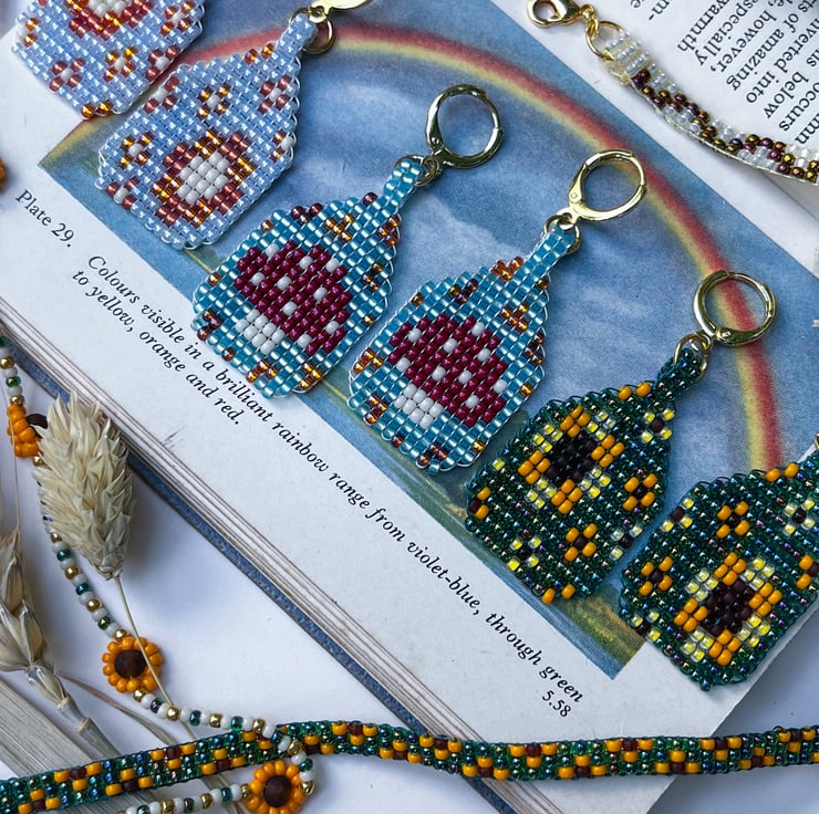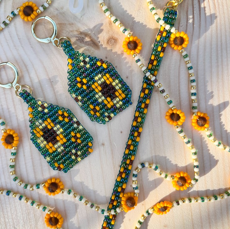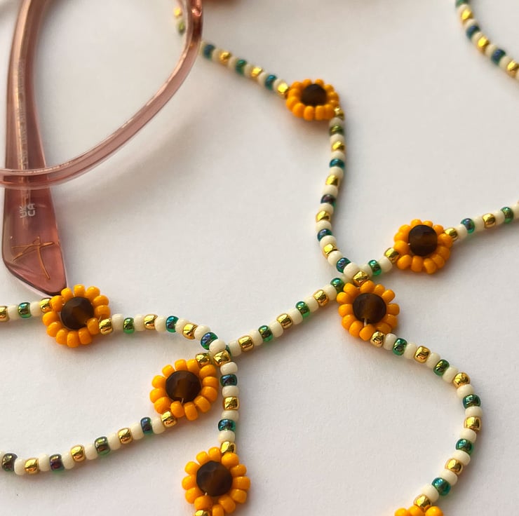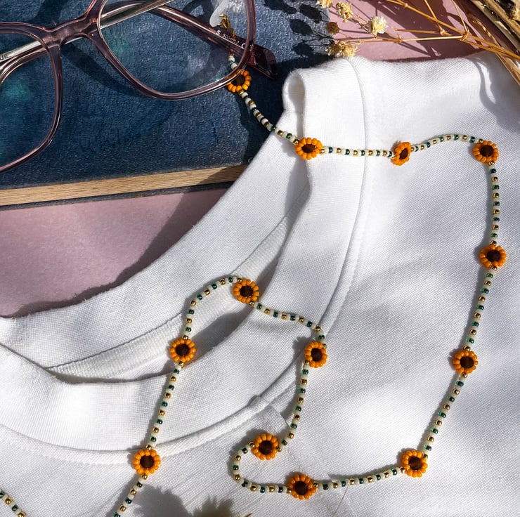 Inspired by sunflowers in late summer and the golden glow of autumn, this playful glasses chain is a reminder to carry a little sunshine with you every day. It combines nostalgic beadwork with cheerful florals for a piece that feels both practical and joyful — the perfect accessory for lovers of handmade, colourful style.