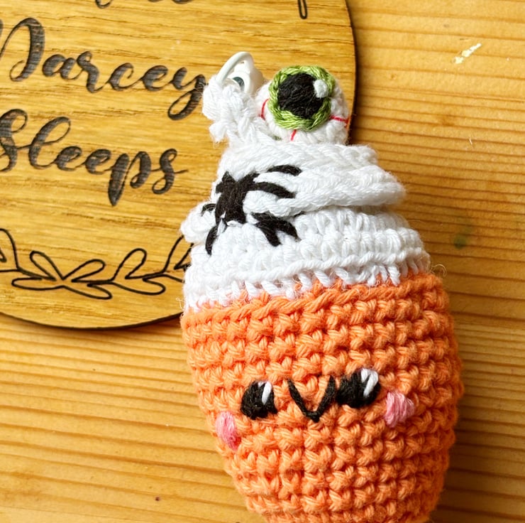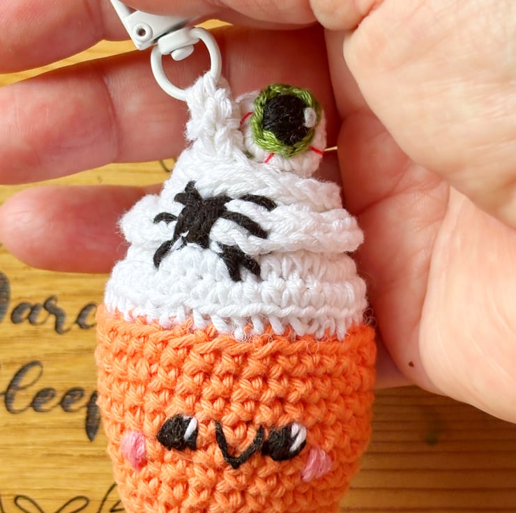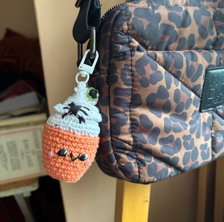 This cute little latte is just as happy on your bag as she is hanging up to celebrate! She features a zombie eye and a little spider! Fitted with a clip that can snap on your bag or use it to hange her up!