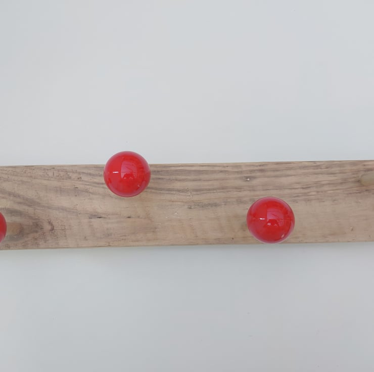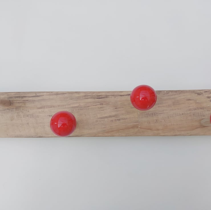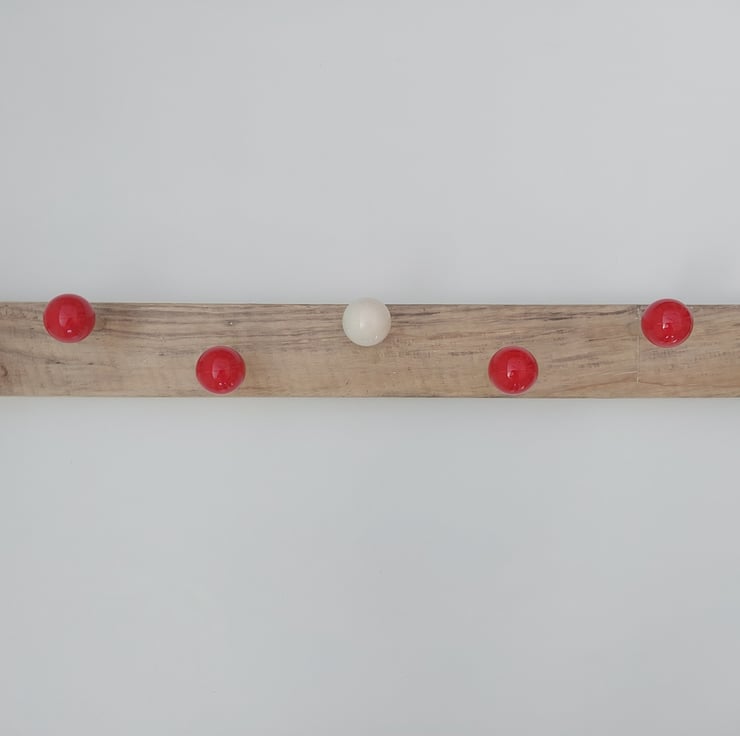 Coat hook rack made from recycled pool balls mounted on solid wood.