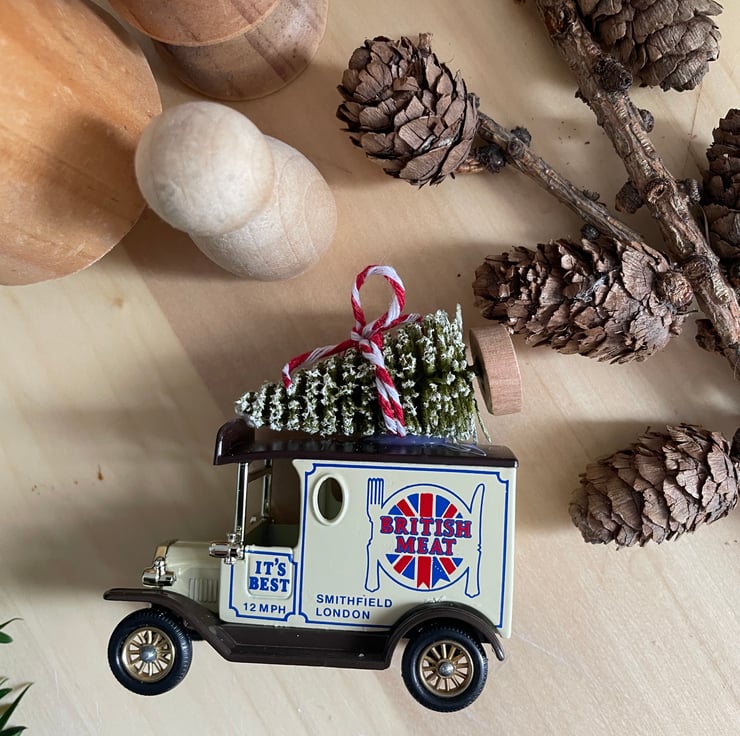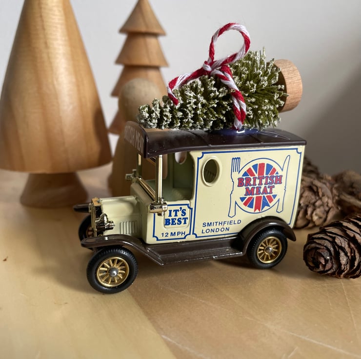Unique re purposed. Collectible die cast van. Great for gift topper, place setting, calendar gift or hang on the tree.
