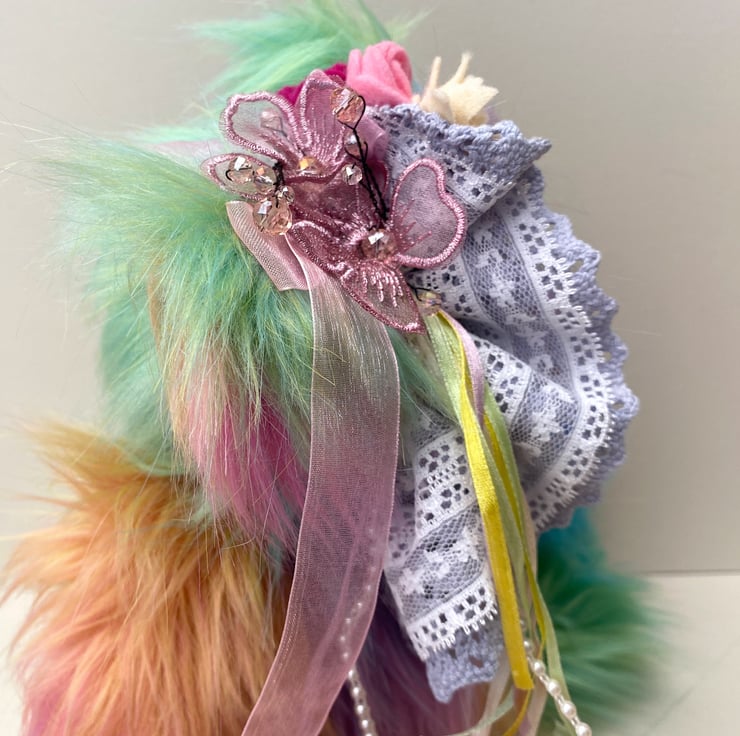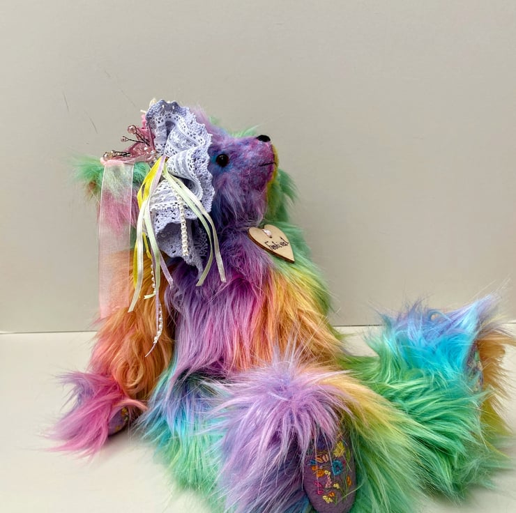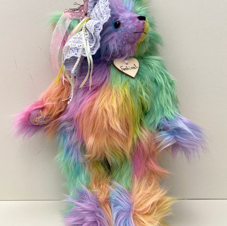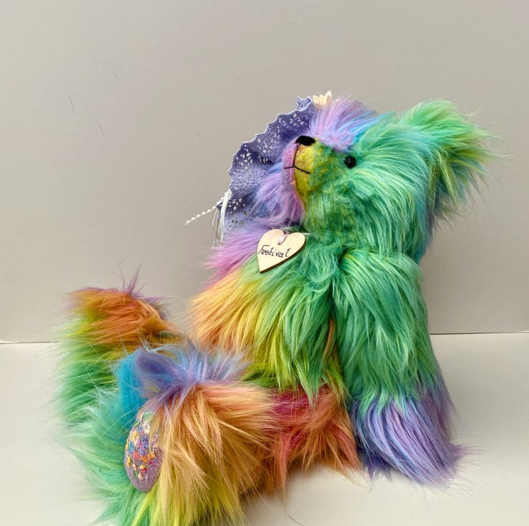 Meet Festival, a beautiful 14” tall unique artist bear. A rainbow bear in long wispy hand dyed mohair fabric.