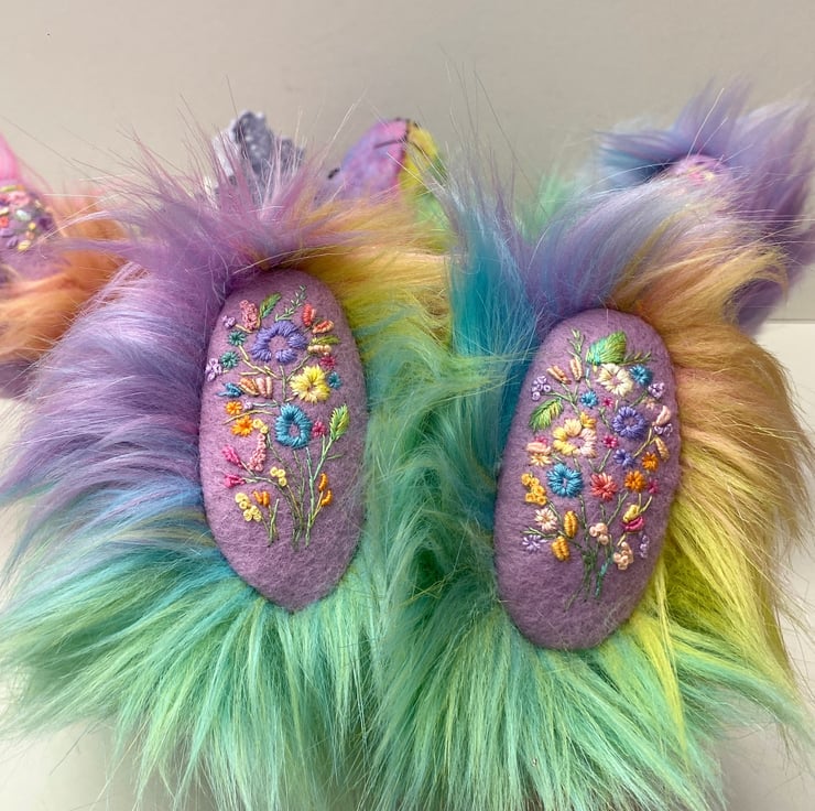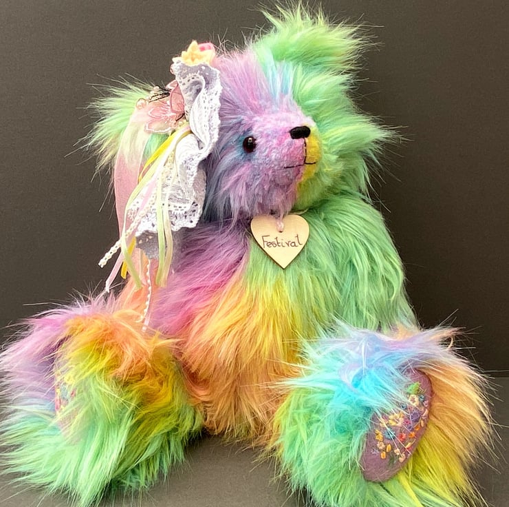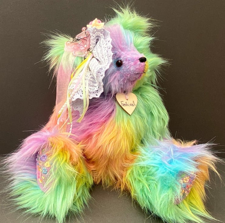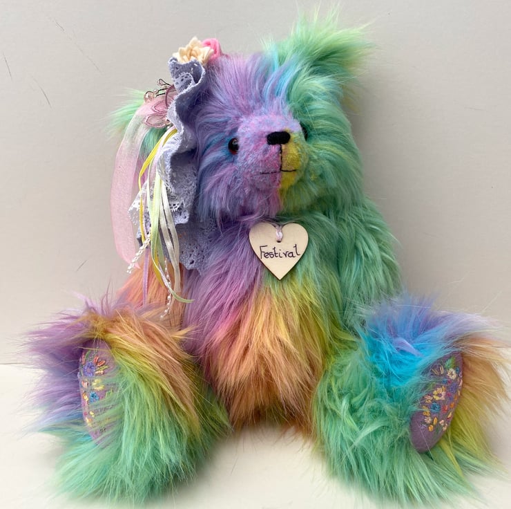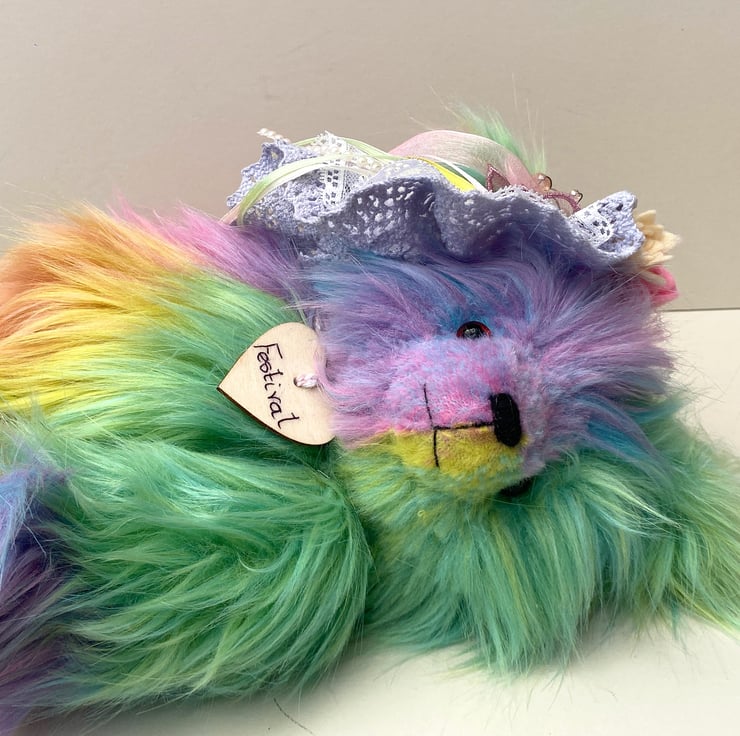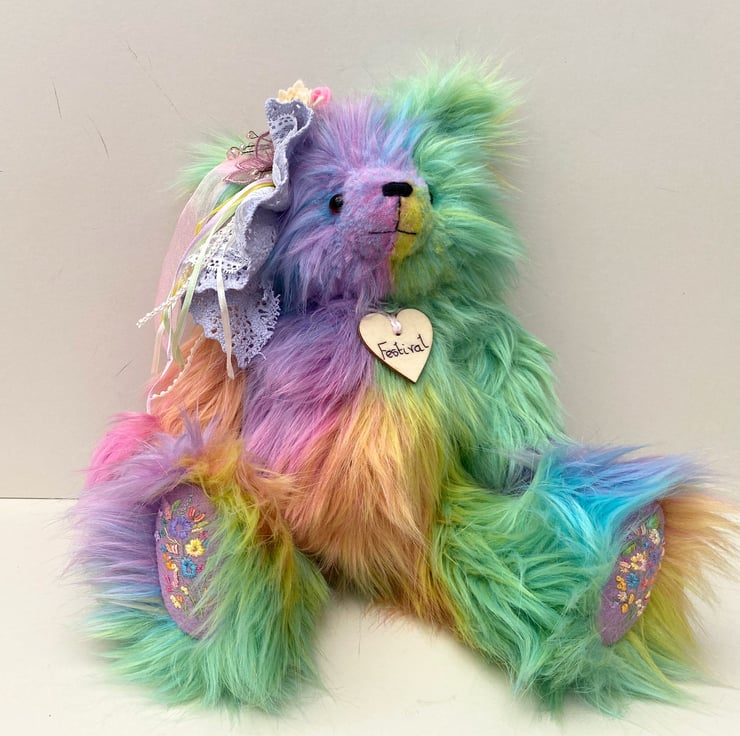 Festival is a pretty collectable heirloom bear, a unique little lady with colourful hand embroidered floral paws in colours to match her rainbow dyed fabric onto lavender wool felt.