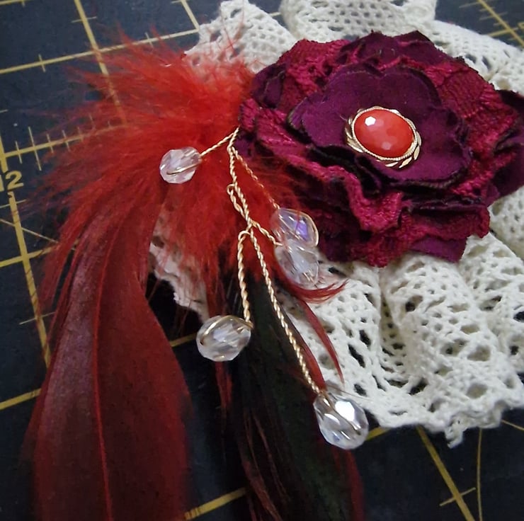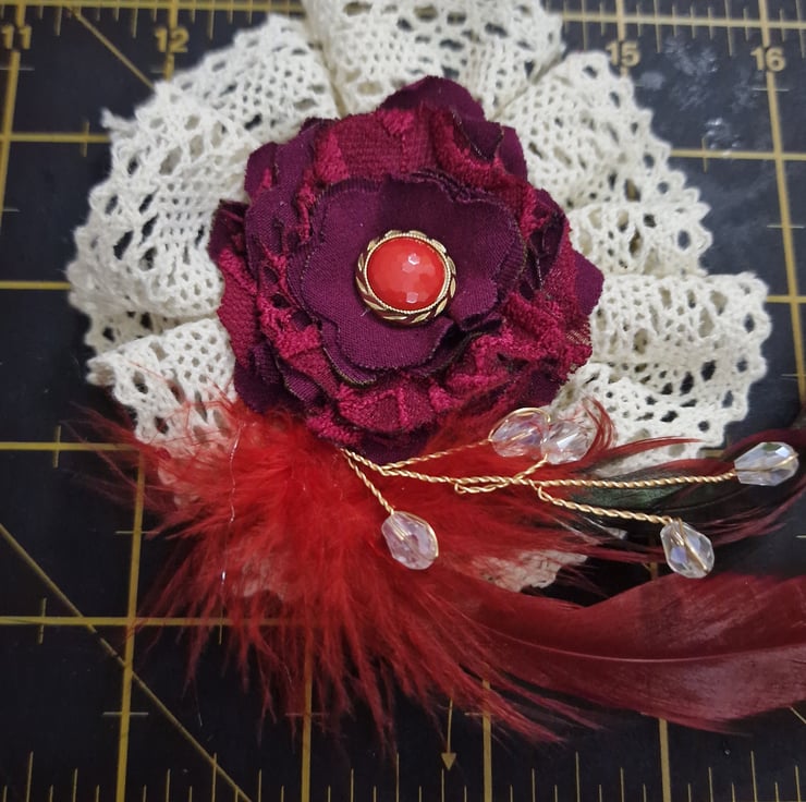Another flower design made from fabric, crafting lace, feathers and embellishments.