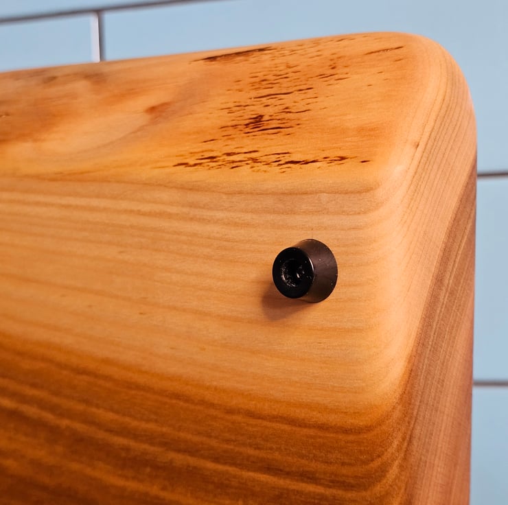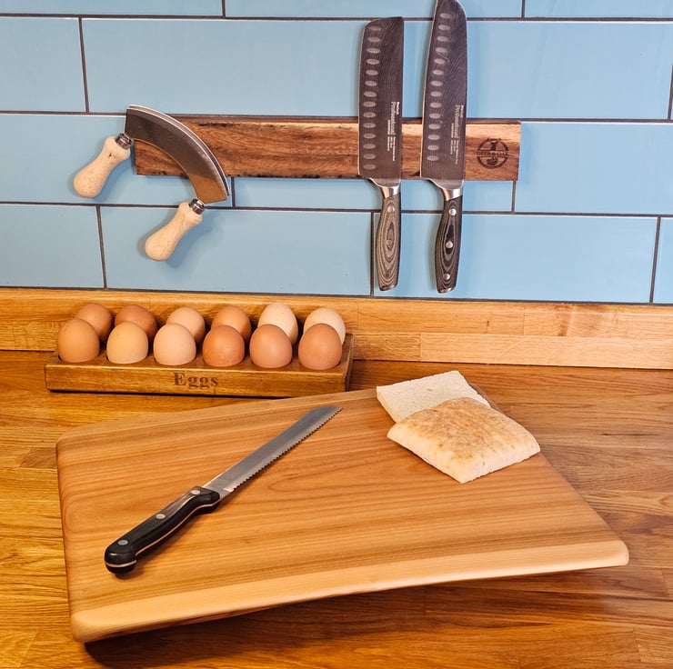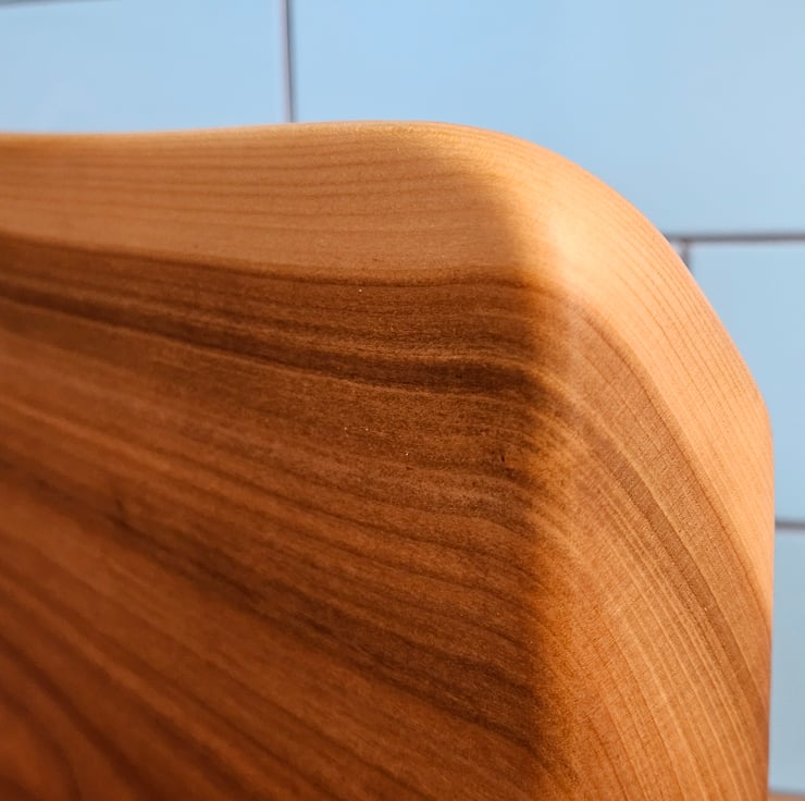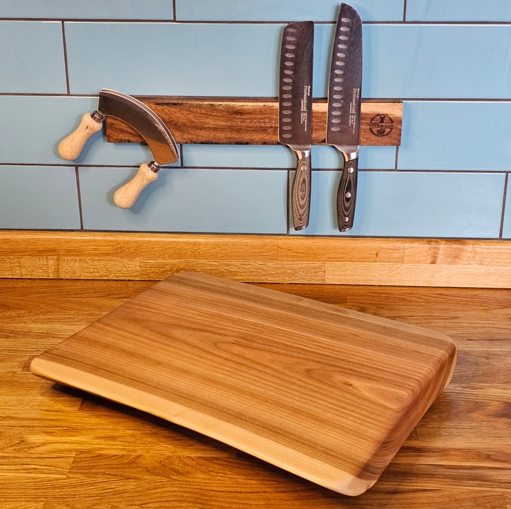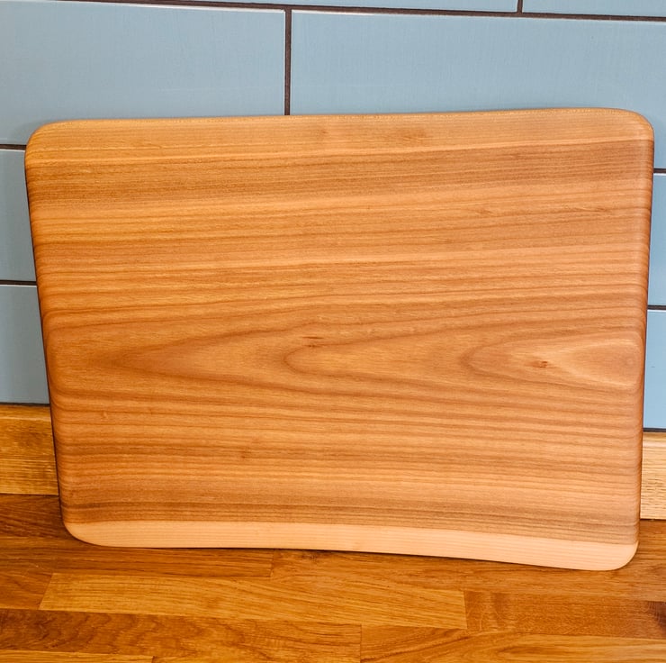 Crafted for the culinary enthusiast, this medium-sized Live Edge Cherry Cutting/Chopping Board brings a touch of rustic elegance to your kitchen. Made from high-quality wood, it features a unique medium brown wood tone that not only adds a natural aesthetic to your prep area but also ensures durability and longevity. The board's rectangular shape, measuring 40cm in length and 30.5-33cm in width, provides ample space for chopping and serving. Each board is meticulously handmade, highlighting the natural beauty of the wood grain. Finished with three coats of food safe mineral oil and one coat of mineral oil/beeswax Board Balm. The board also comes with a free tin of 30ml Board Balm, a moisturising cream that nourishes the wood. Our boards also come fitted with rubber feet to ensure stability in use.