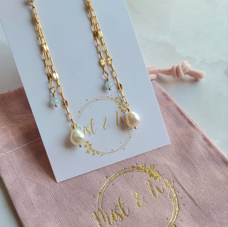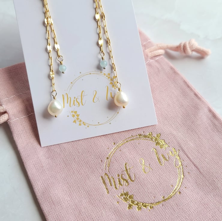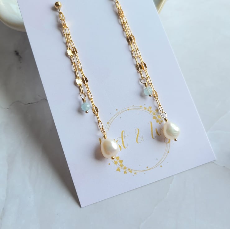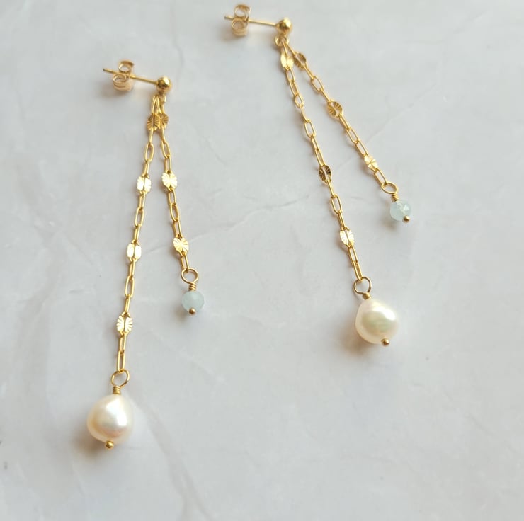 These beautiful gemstone and pearl earrings have been created with aquamarine gemstones and freshwater pearls. The gemstones and pearls have been wire wrapped with care onto a delicate 14kt gold filled starburst style chain. These stud drop earrings are 6.5cm in length and come with butterfly backs.