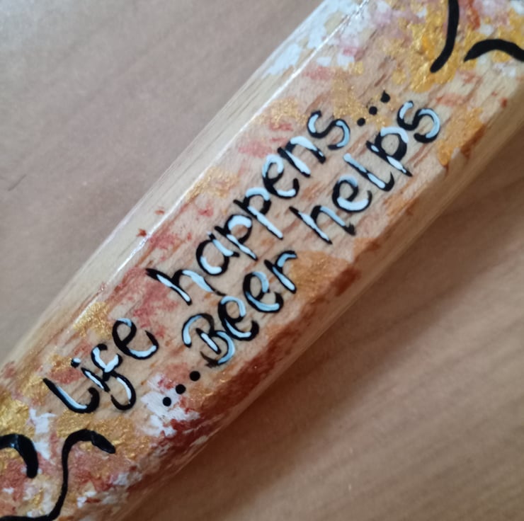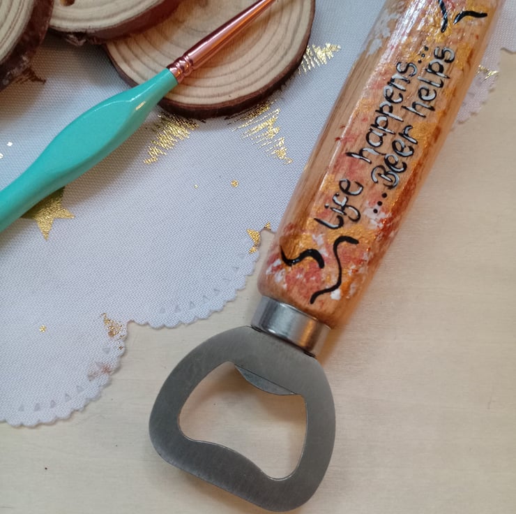 A unique bottle opener with a hand painted wooden handle featuring the words 'life Happens Beer helps'