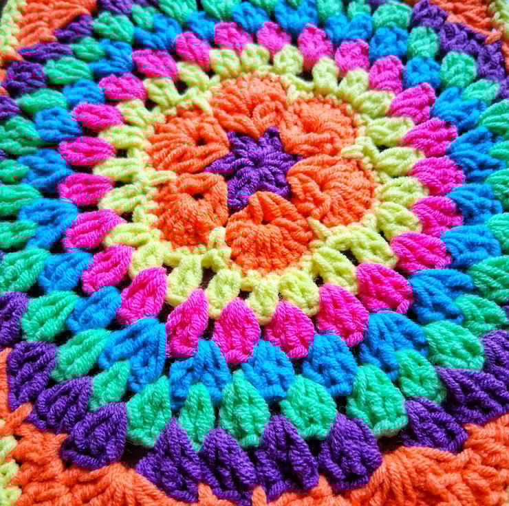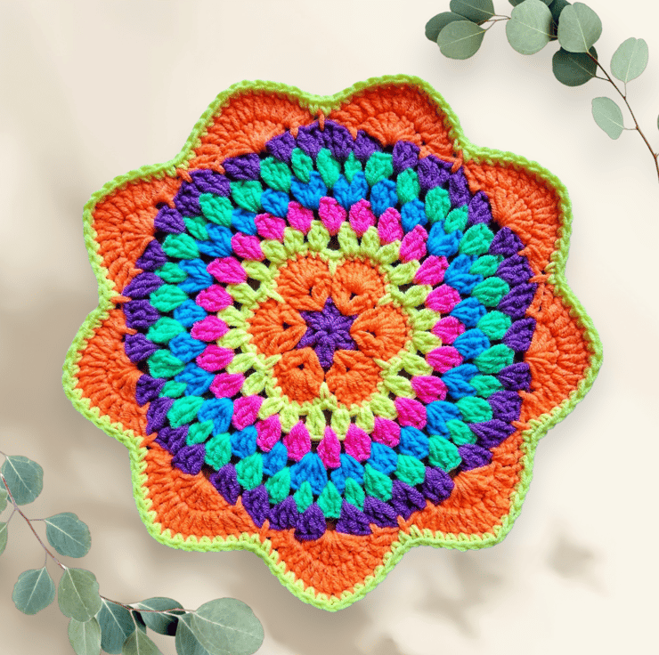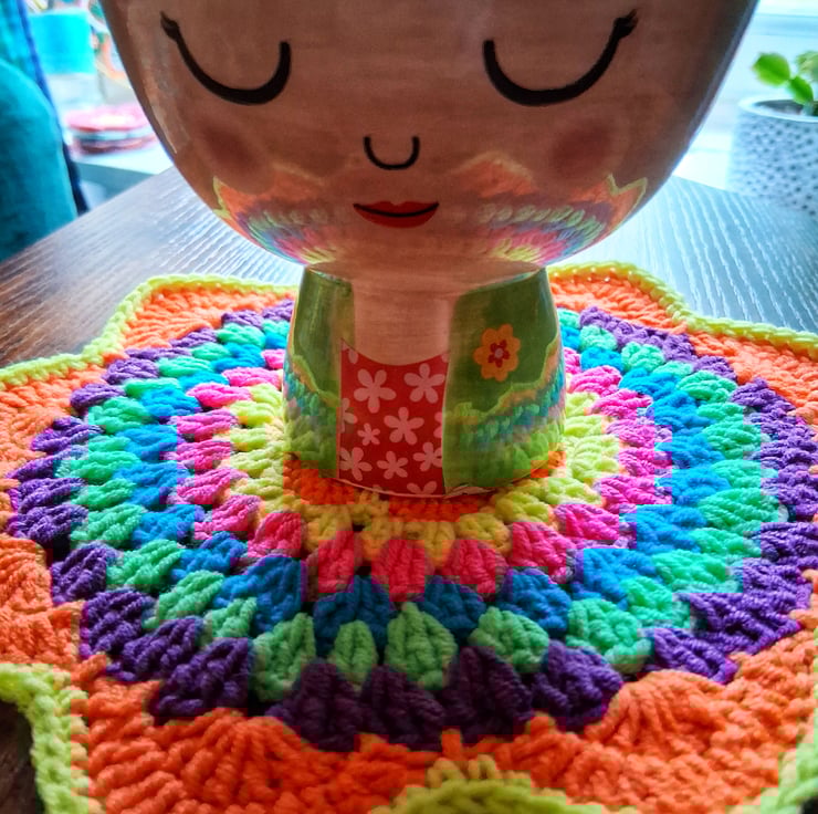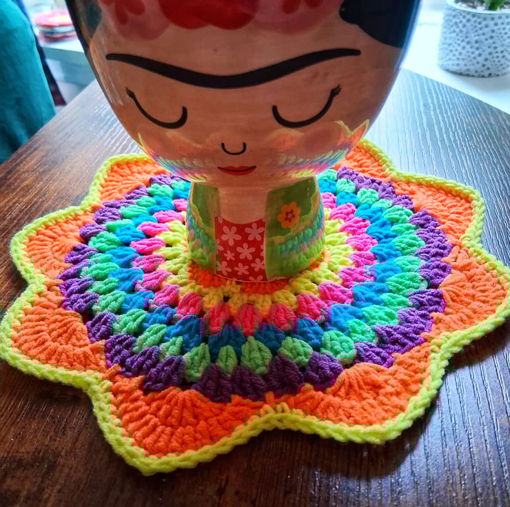 This colourful crochet mandala doily would brighten any table. Crocheted in a soft cotton blend yarn for ease of wash and colour retention. 22 cm diameter.
