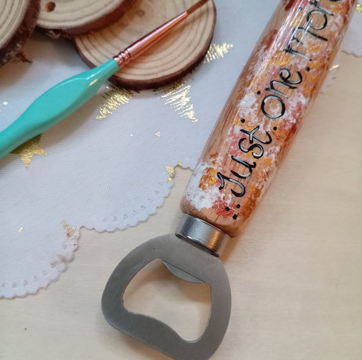 A unique bottle opener with a hand painted wooden handle featuring the words 'just one more'