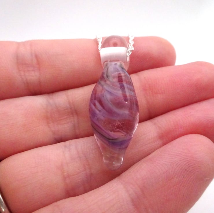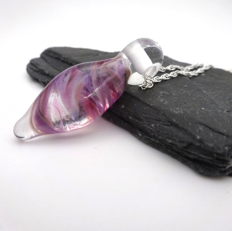 A sterling silver chain which features a handmade lampwork glass droplet pendant.