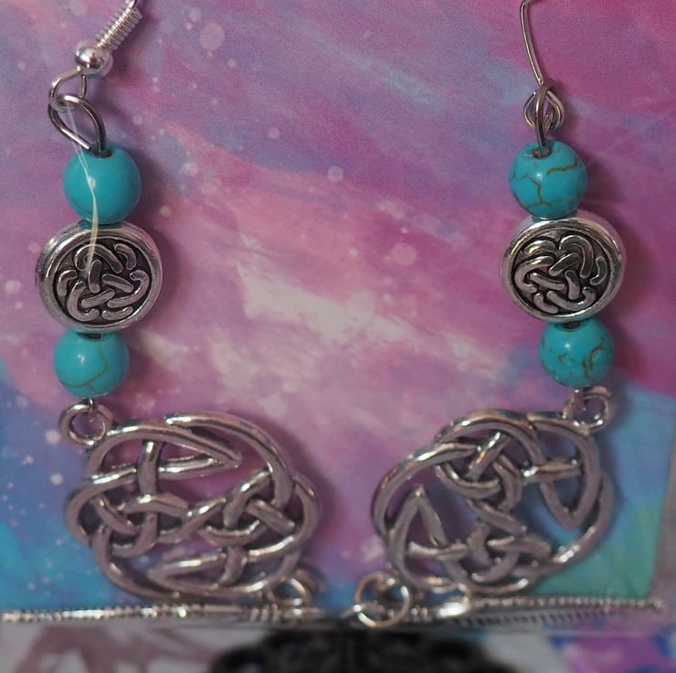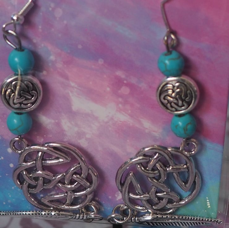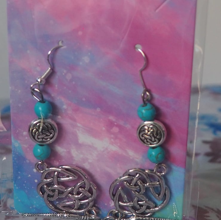 This set of earrings comes from a collection of 14 pairs of turquoise beaded and metal charm designs which feature sun's, stars and moons, celtic knots as well as feathers and other small details. Each pair are on hypoallergenic, silver-plated hooks with rubber backs.