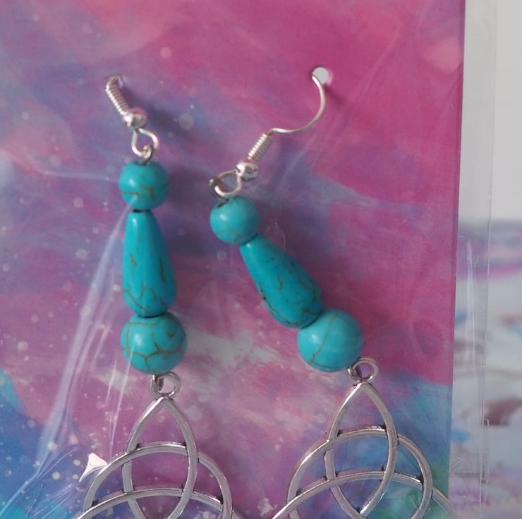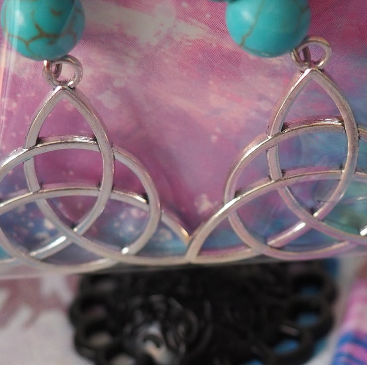 Turquoise Beaded Dangle Earrings With Celtic Knot Triangular Charms