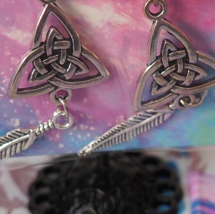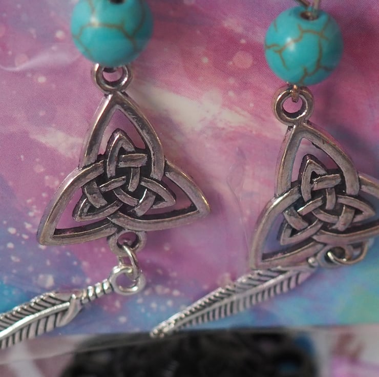This set of earrings comes from a collection of 14 pairs of turquoise beaded and metal charm designs which feature sun's, stars and moons, celtic knots as well as feathers and other small details. Each pair are on hypoallergenic, silver-plated hooks with rubber backs.