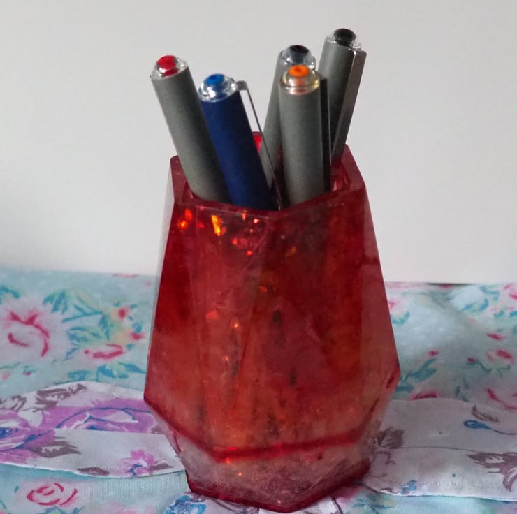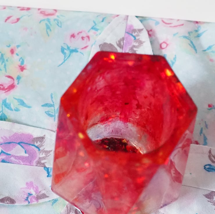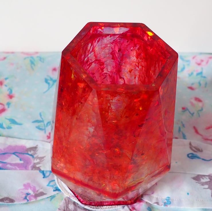 This hexagonal resin pot is 8cm wide by 10cm high and would look smart in any room of the house. It can be used for a variety of different purposes such as a vase for fresh or fake flowers, pens or pencils, small cooking utensils or make-up brushes. The outside of the pot is hexagonal but the hole in the middle is circular. This pot is in red, orange and yellow and is transparent. Please note the due to the nature of resin some small air bubbles may be present and items are not dishwasher safe. If you would like this item in another colour combination or a matching item then please contact me as custom items are available.