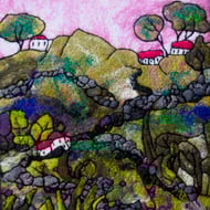 An original landscape picture in Merino wool and silk, wet felted and overstitched. An Autumnal fantasy landscape in silk and wool.