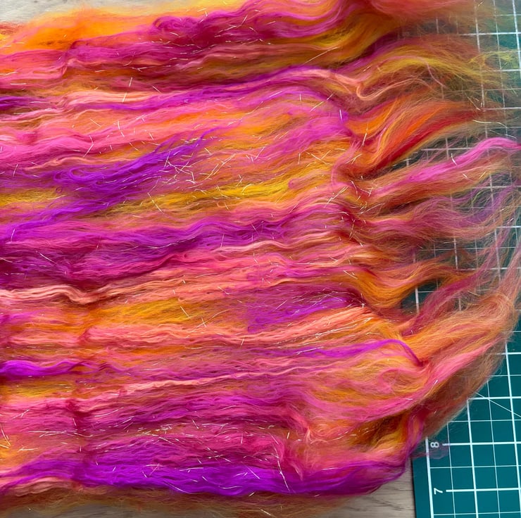 Each batt is hand carded on a drum carder. I incorporate lots of Silk and Sparkle fibres to make my batts extra special. Easy to spin, either directly from the batt or pre-drafted through a Diz if preferred. Beautiful Sunset is built up over 3 to 4 layers. Each layer contains all the fibres stated. The batt is folded and packed in a cellophane bag for ease of posting. Up to two batts are sent in an environmentally friendly mailing bag, heavier batts are boxed.