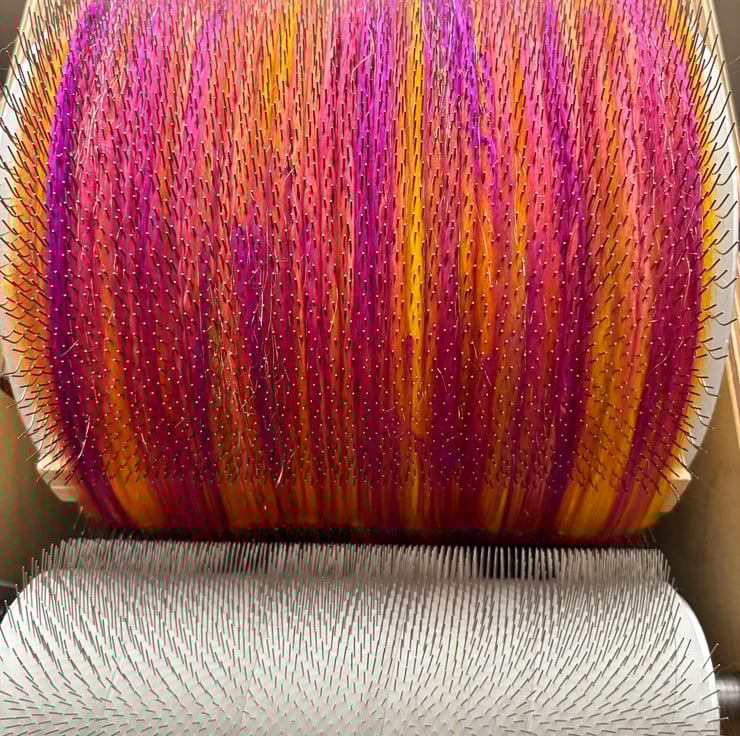 As the batt's name implies, the colours reflect a beautiful sunset and living in the fens with incredible views of the skies, I am able to witness many sunsets with incredible colour palettes all through the year. This particular batt reflects warm summer evenings walking with my Studio Quality Control Assistant (Arwen, my beautiful Deerhound) at the end of my working day, out on the fenland landscape that surrounds my village.
