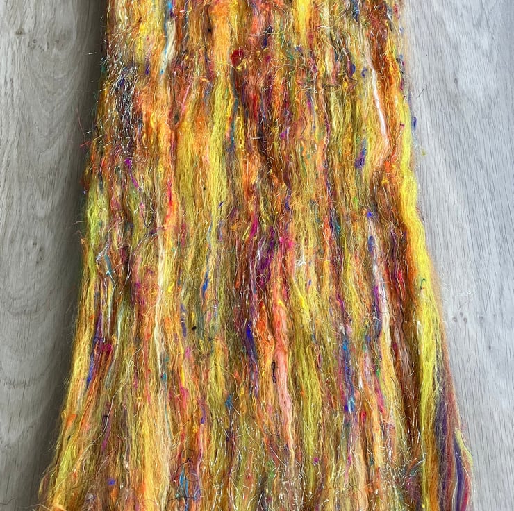 Each batt is hand carded on a drum carder. I incorporate lots of Silk and Sparkle fibres to make my batts extra special. Easy to spin, either directly from the batt or pre-drafted through a Diz if preferred. Bright Summer Flowers has been built up over 3 layers. Each layer contains all the fibres stated. The batt is folded and packed in a cellophane bag for ease of posting. Orders for up to two batts are sent in an environmentally friendly mailing bag, heavier batts are boxed.