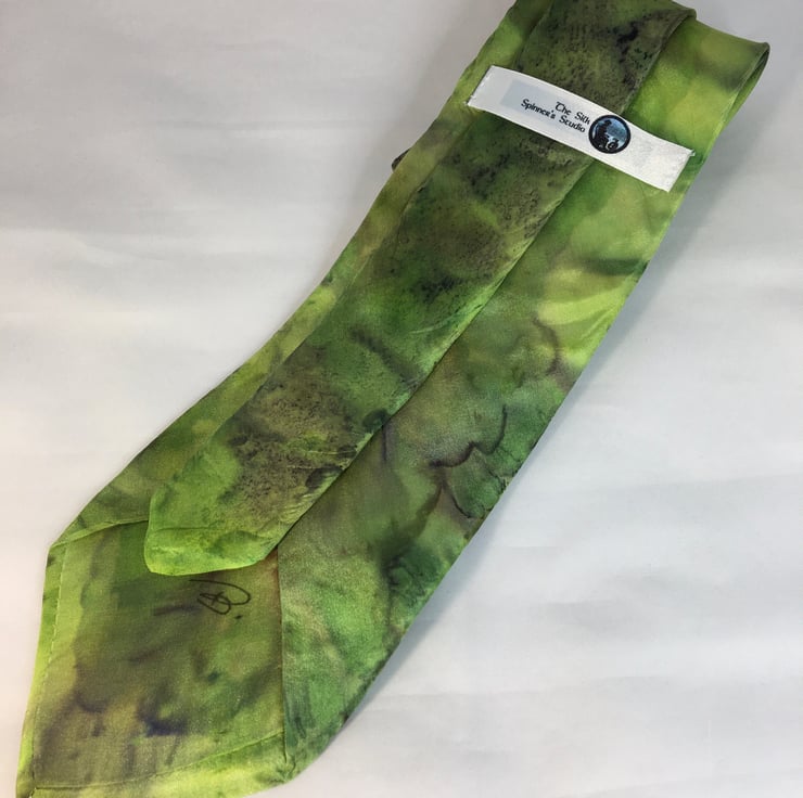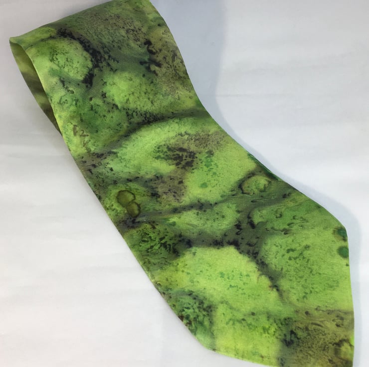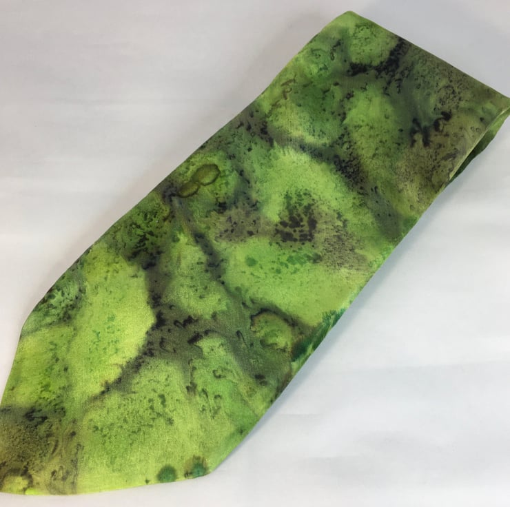 A Hand Painted 100% Silk Necktie. I use French steam fix Silk dyes and a salt effect technique to produce the overall abstract pattern.