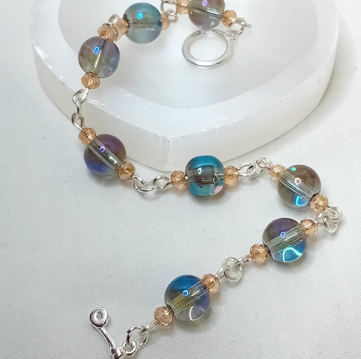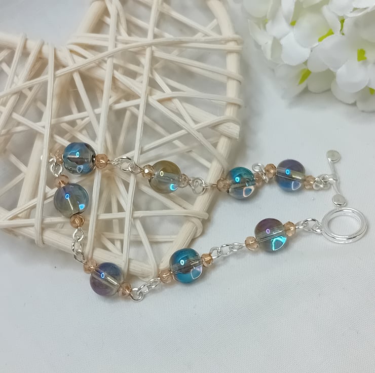 This exquisite bracelet features 8mm iridescent glass beads paired with 3mm Austrian crystals, creating a captivating sparkle. The base is crafted with a sterling silver-plated ring design and secured with a sterling silver toggle clasp. Measuring a standard 7 inches, it can also be customized to your desired size.
