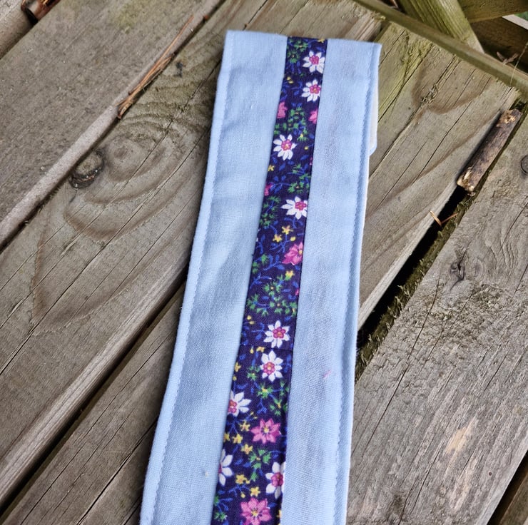 It is made from a central dark blue floral upcycled poly cotton fabric with strips of pale blue upcycled cotton fabric and is lined with an upcycled cotton lining.