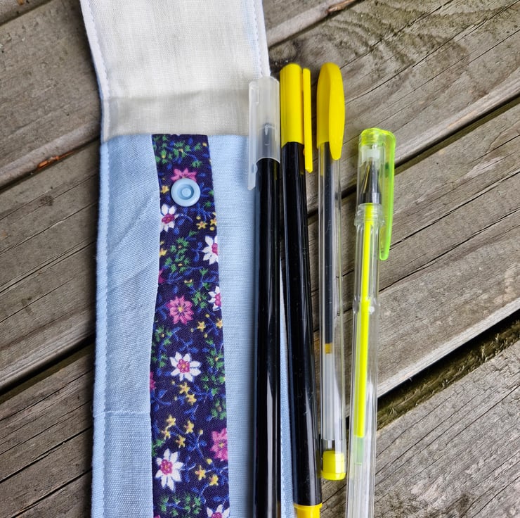 Blue and floral Pen case with 4 yellow pens ideal stocking filler