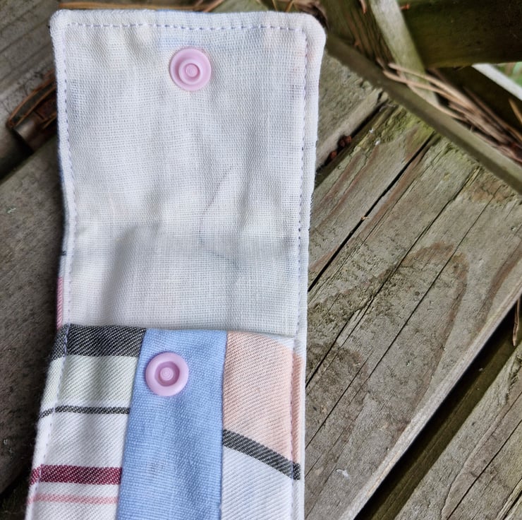 It is made from a central dark blue floral upcycled poly cotton fabric with strips of muli-coloured striped upcycled poly cotton fabric and is lined with an upcycled cotton lining.