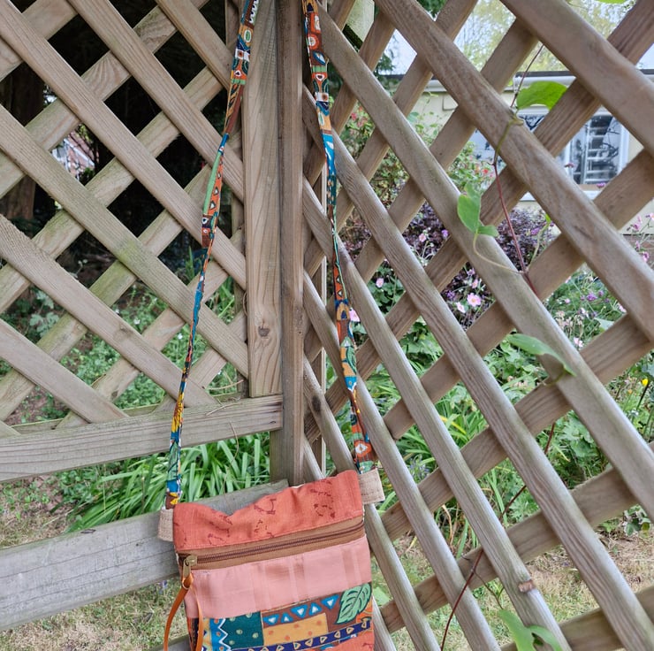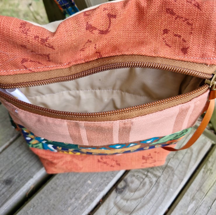 This neat bag measures 19cm x 20 cm and has a brown nylon zip across the whole width.