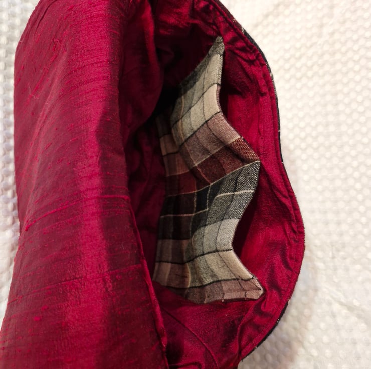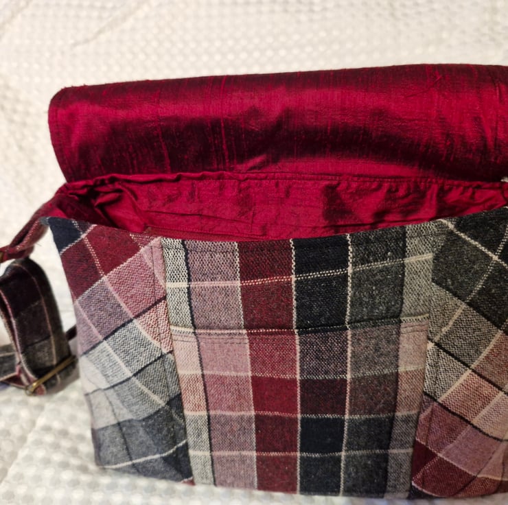 The interior is made from burgundy silk and has 2 pockets. One is a zipped pocket to the back of the bag, the other is a split patch pocket to the inside front in the same fabric as the exterior of the bag.