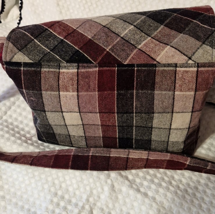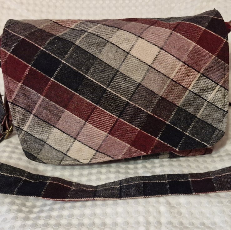 It is made from a wool mix fabric with burgundy, black, grey and pink checks .