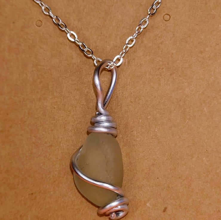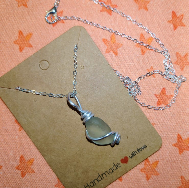 Bring the calm of the sea to your style with this handmade pale sage green seaglass necklace. Each piece of seaglass is naturally shaped and frosted by the waves, then carefully wrapped aluminium wire for a lightweight and affordable finish.