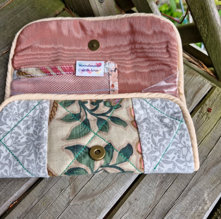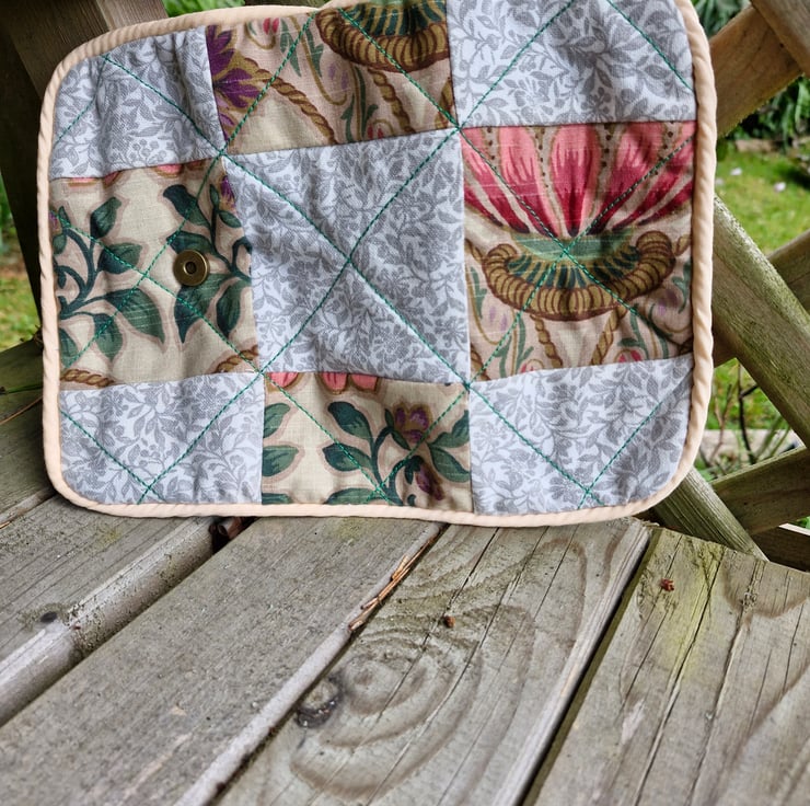 Made from upcycled grey and white patterned cotton and green and beige multicoloured cotton squares which were quilted onto upcycled fleece , then assembled using a peachy pink watermark lining onto which some cotton edged netting was stitched and edged with some upcycled cotton/polyester piping.