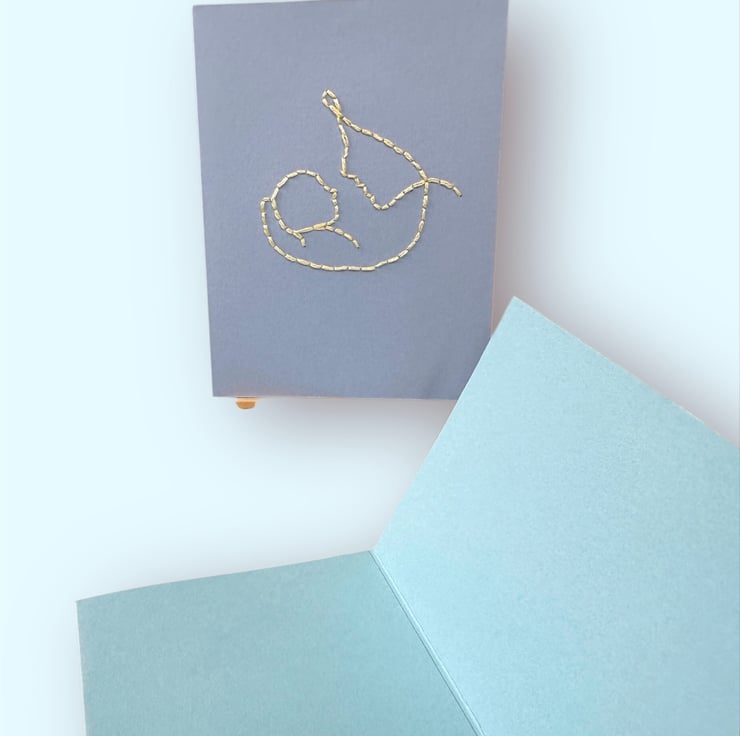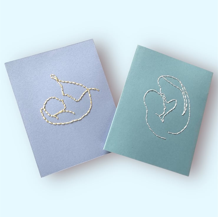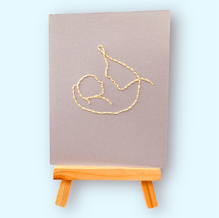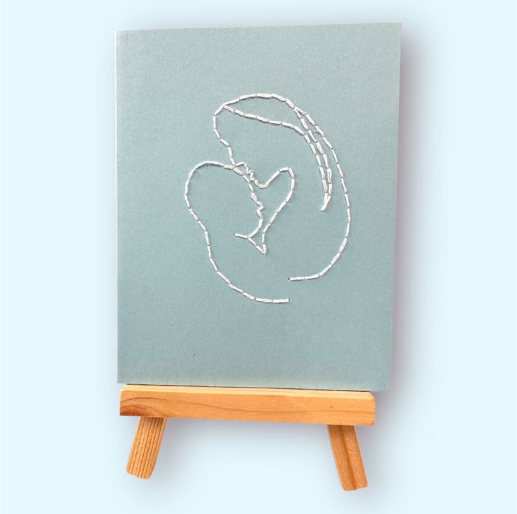 Delicately embroidered onto thick pastel shades of card with white or soft pastel yellow DCM thread. These abstract images are both of a mother gazing adorably at her new baby.