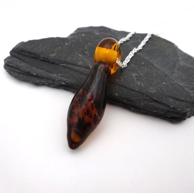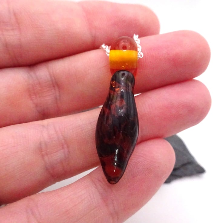 A sterling silver chain which features a handmade lampwork glass droplet pendant.