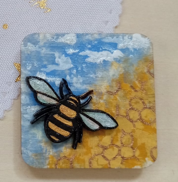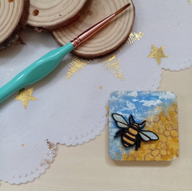A 4cm x 4xm wooden square shaped fridge magnet hand painted in a sky and honeycomb style design with a raised bumble bee detail