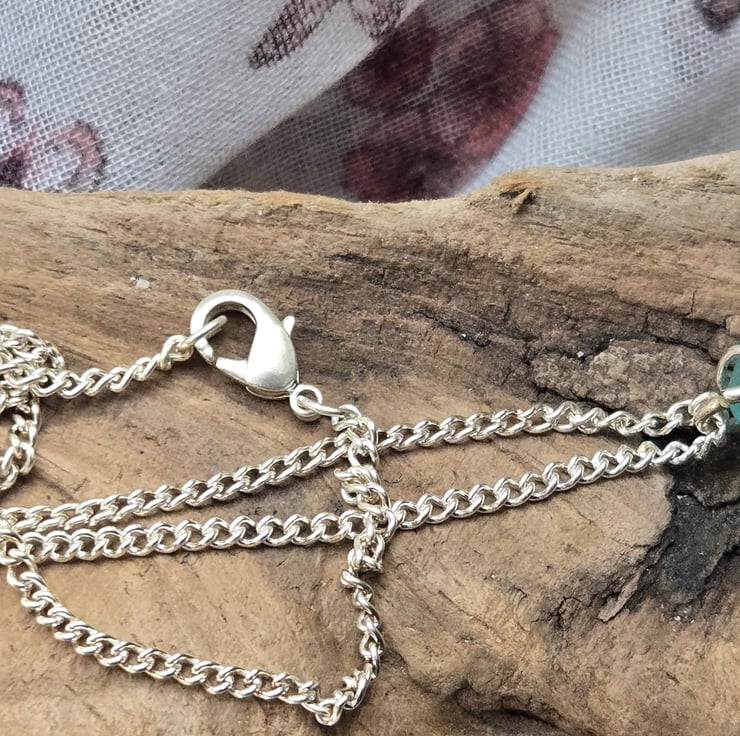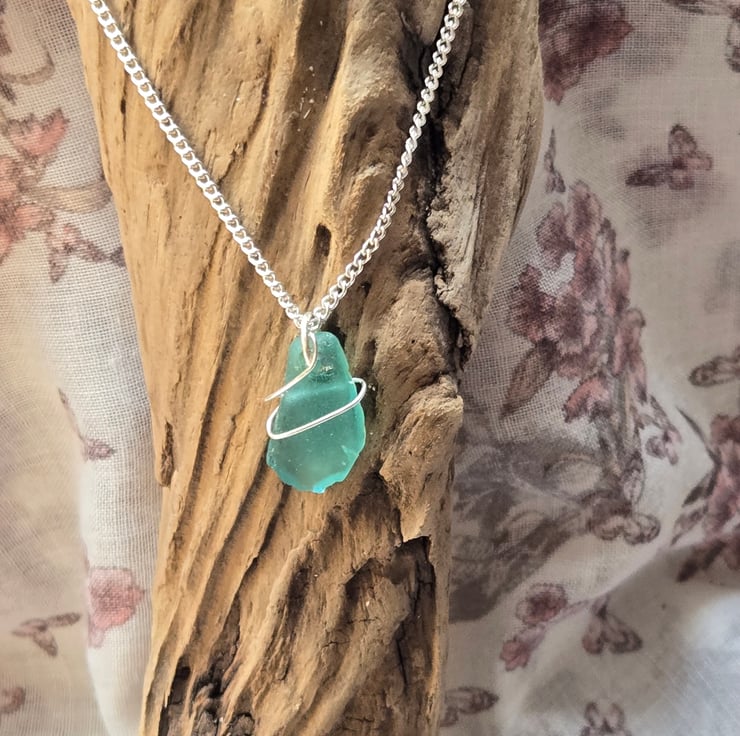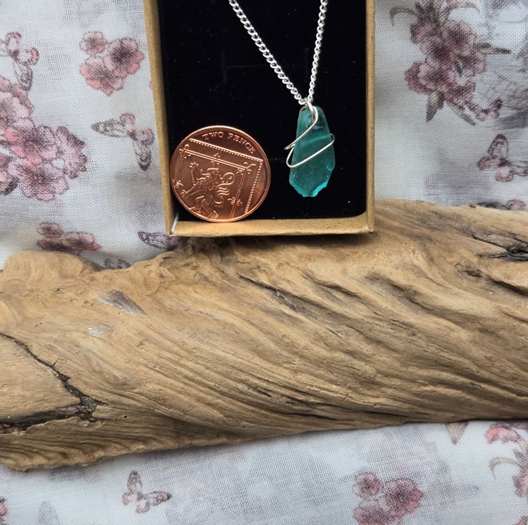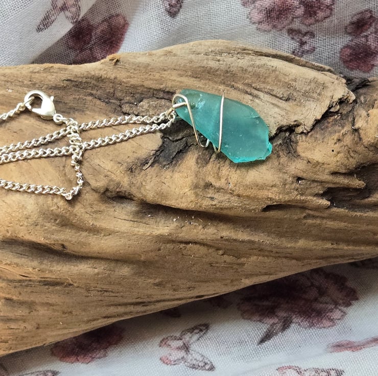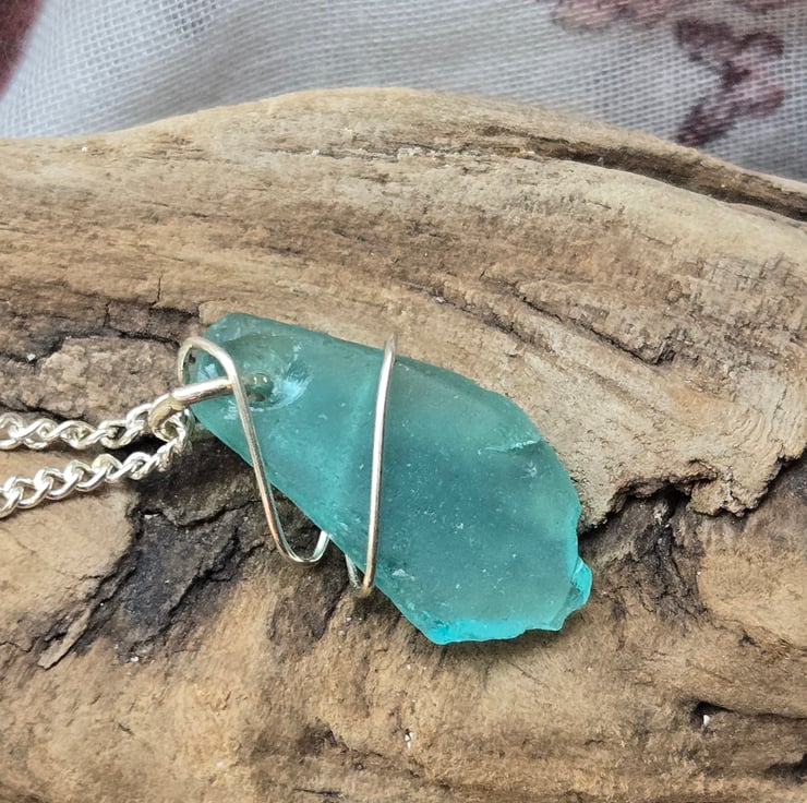 A beautiful azure blue rounded triangular piece of sea glass wire wrapped in silver wire and placed on a silver 18 inch(46cm) chain with a lobster clasp. The necklace is presented in a box. The colour blue symbolises serenity and trust whilst the sea glass symbolises renewal and hope.