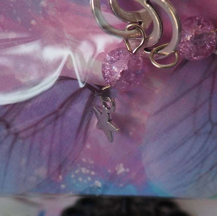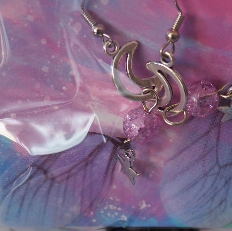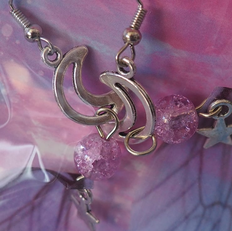 This set of earrings comes from a collection of eight pairs with pastel coloured organza butterfly wings, silver chains, moons, stars and glass beads. Each pair are on hypoallergenic, silver-plated hooks with rubber backs.