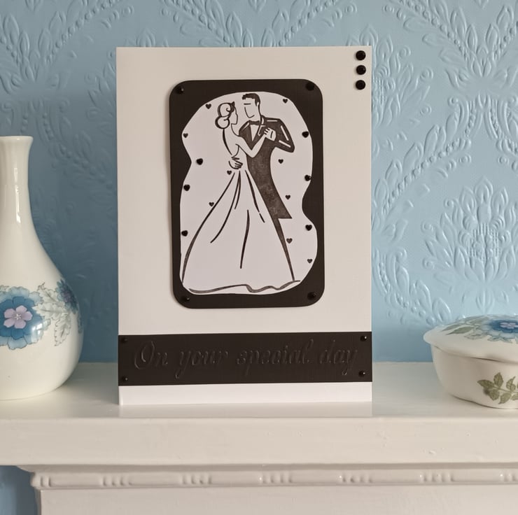 This pretty card features a stamped image of a bride and groom dancing. This image is mounted on black card. The sentiment 'on your special day' is embossed on black card and attached to the bottom of the card. The card is finished with black faux gemstones and would be ideal for a wedding.
