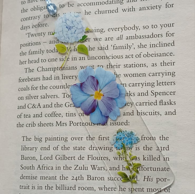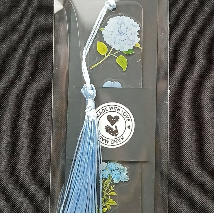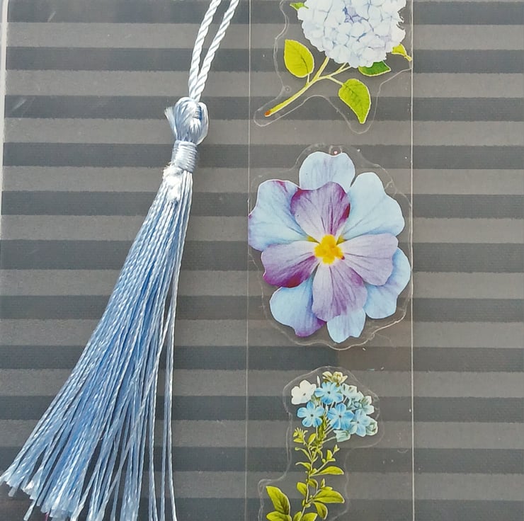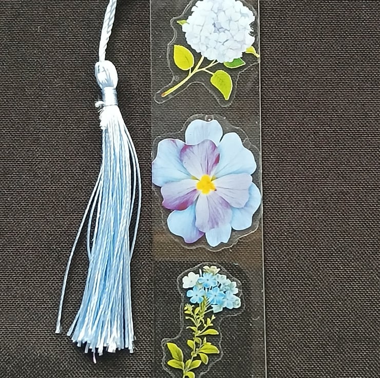 Clear acrylic bookmark decorated with blue flowers transparent decals.