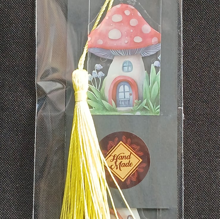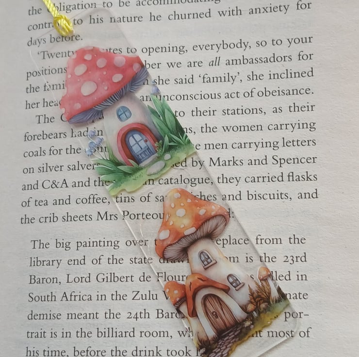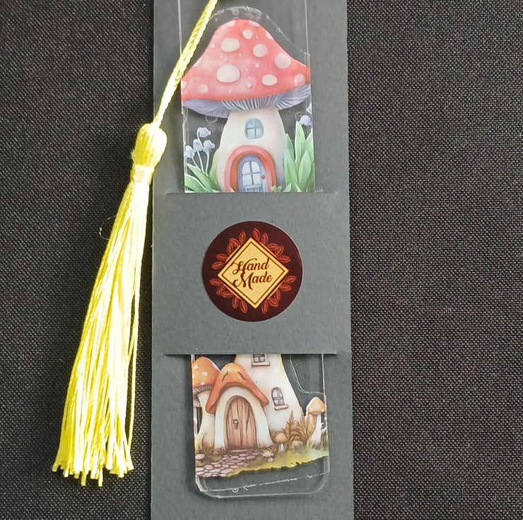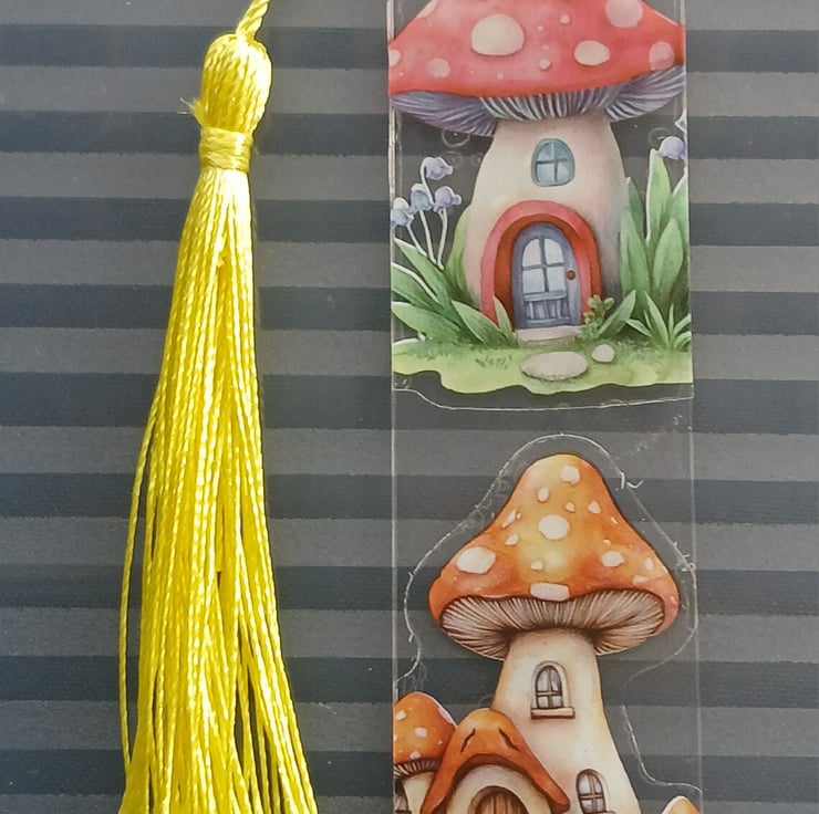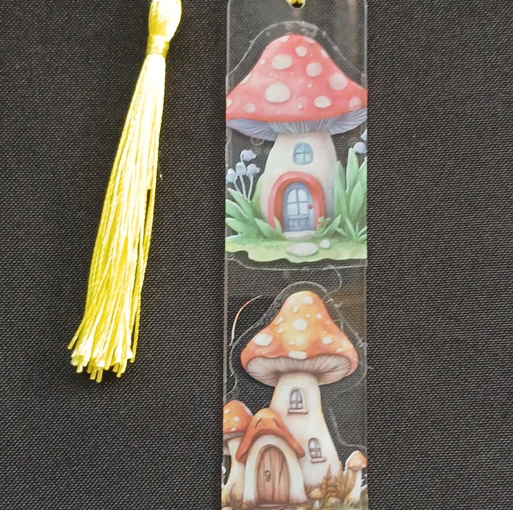 Clear acrylic bookmark decorated with toadstool transparent decals