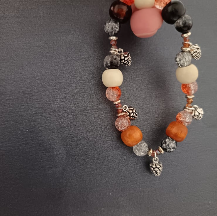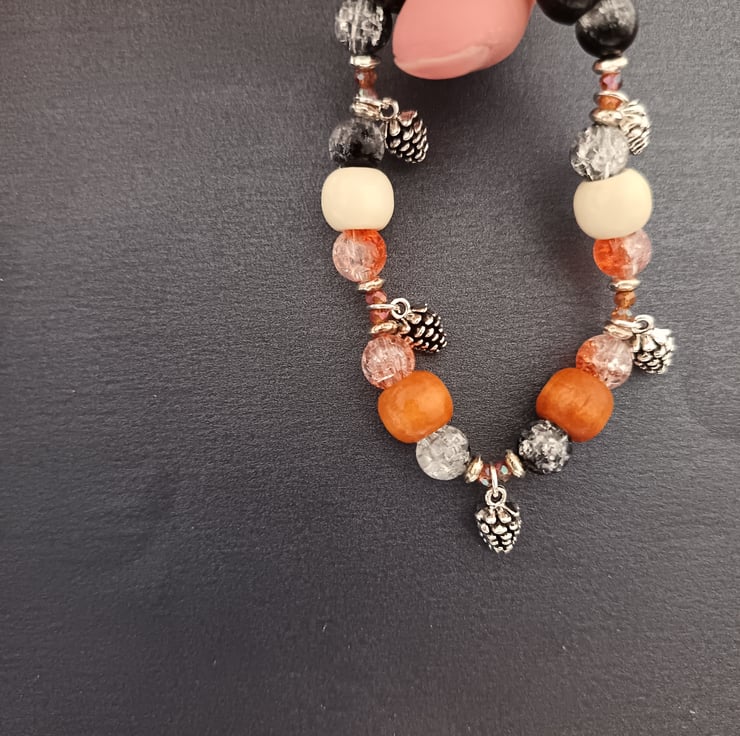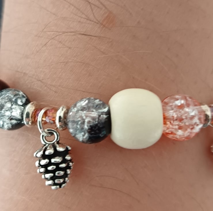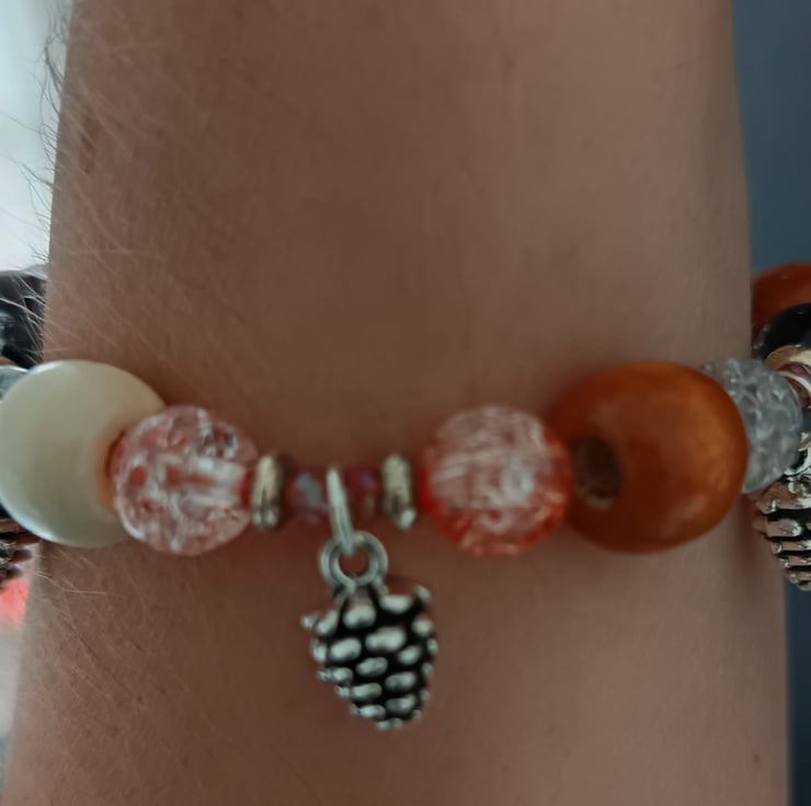This handmade bracelet is crafted with magic stretch elastic, silver pine cone charms and assortment of different sized glass and wooden beads, with decorative silver spacers. The colour scheme is earthy and Autumnal, and this piece measures 7 inches