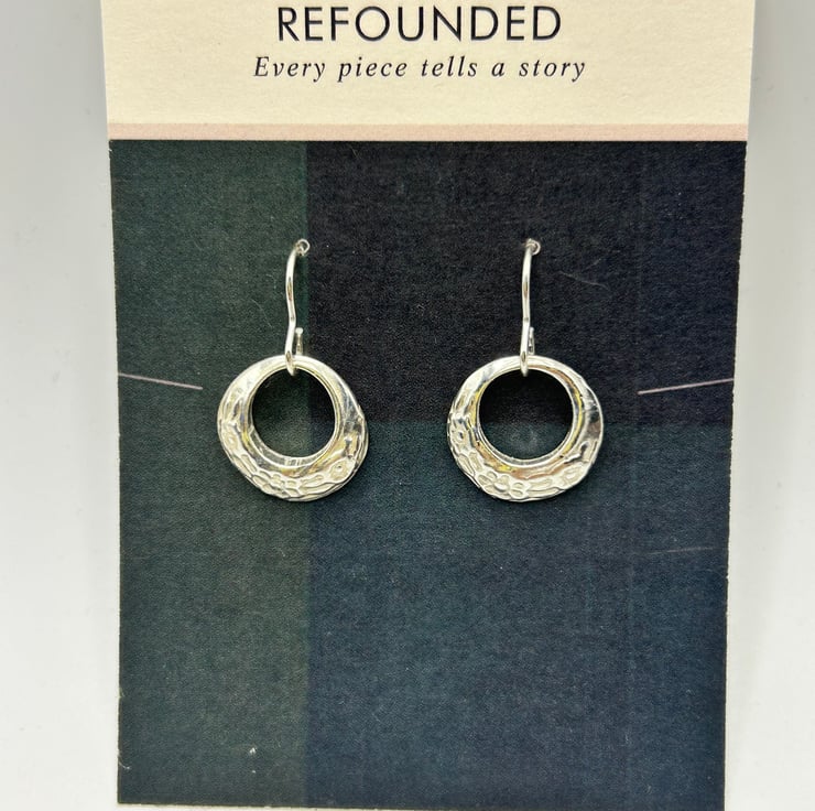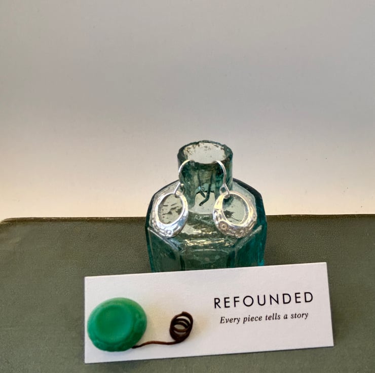 A tribute to the overlooked and the discarded, they offer a new life to a forgotten treasure, refounded and reimagined as wearable art. Each pair is finished recycled sterling silver ear wires, continuing the theme of renewal and sustainability.