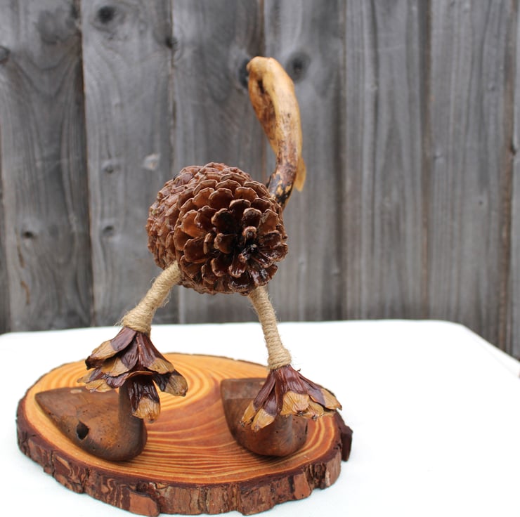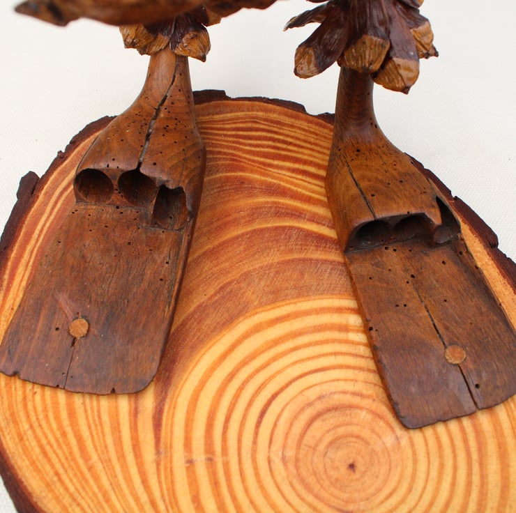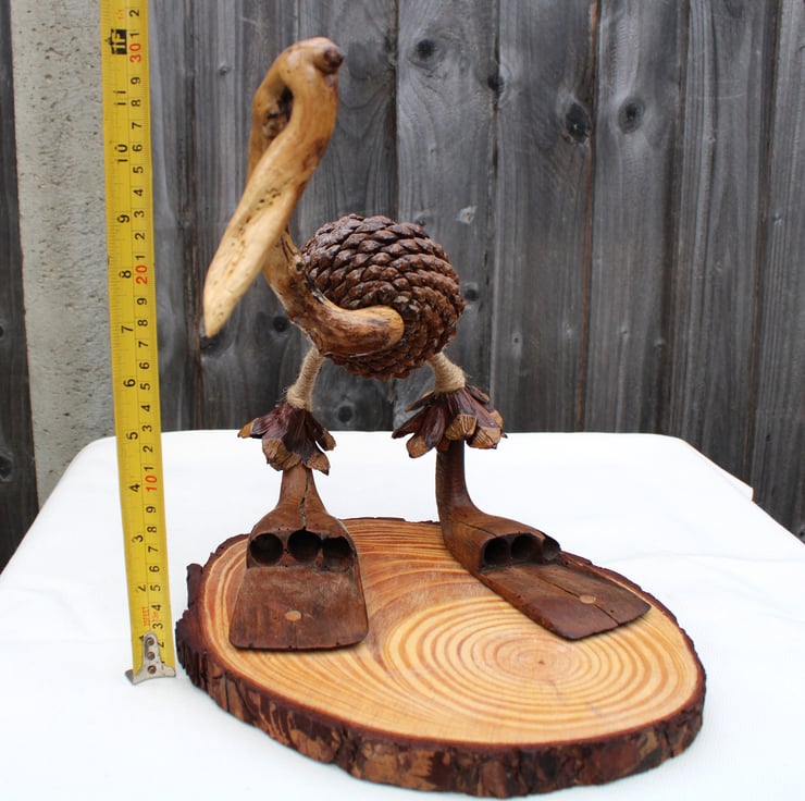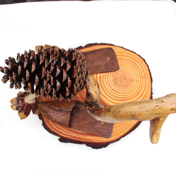 This handcrafted bird sculpture celebrates the poetry of nature and the charm of days gone by. Crafted from wood and pine cones, it exudes the warmth of natural materials while hinting at the timeless tradition of folk craftsmanship.