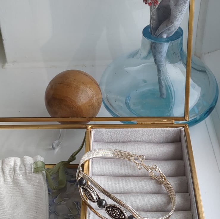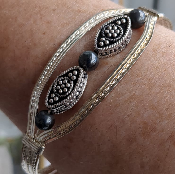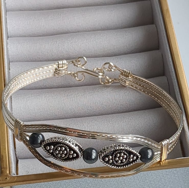 These lovely silver beads are beautifully wrapped in Sterling silver wire to create this stunning bracelet.