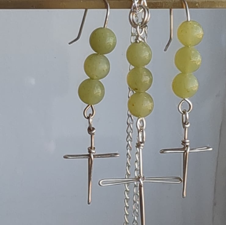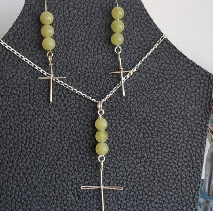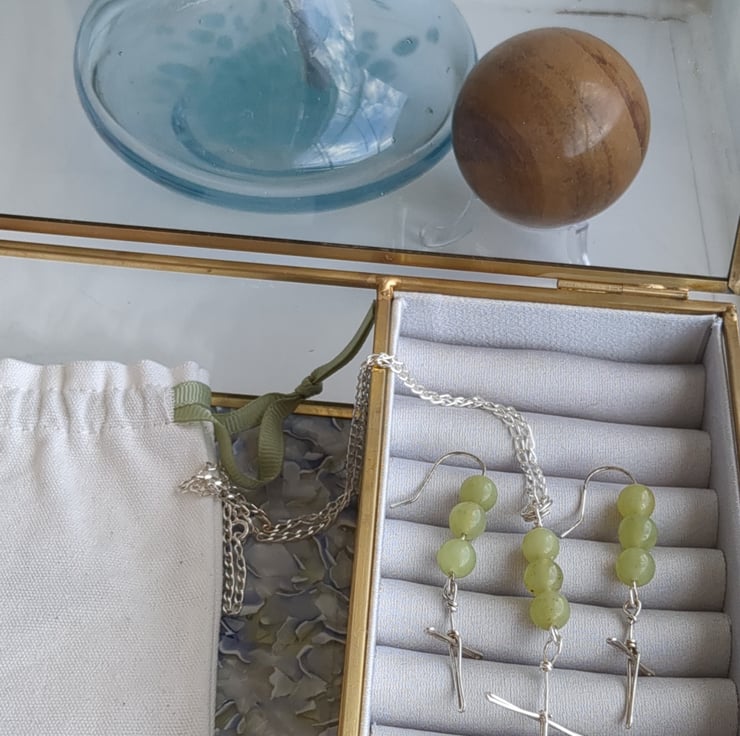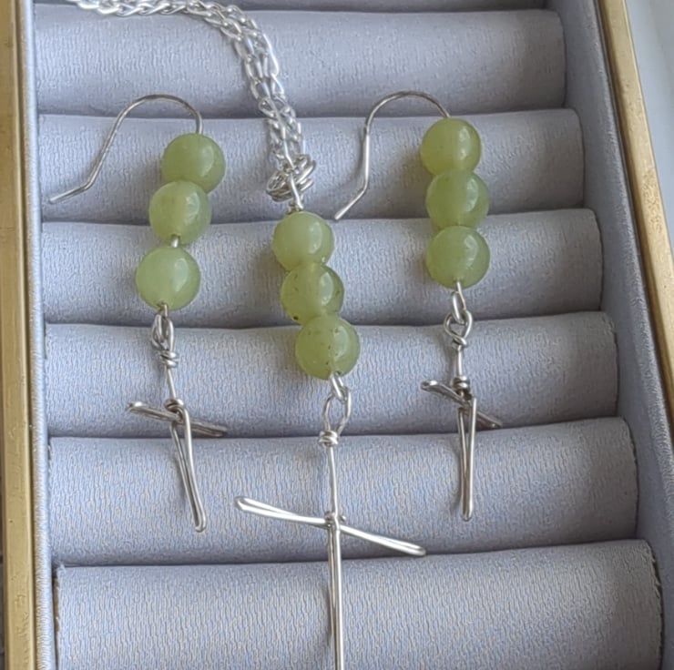 These beautiful green jade beads are crafted into a sterling silver set, with dangle earrings and pendant. In the medieval style.