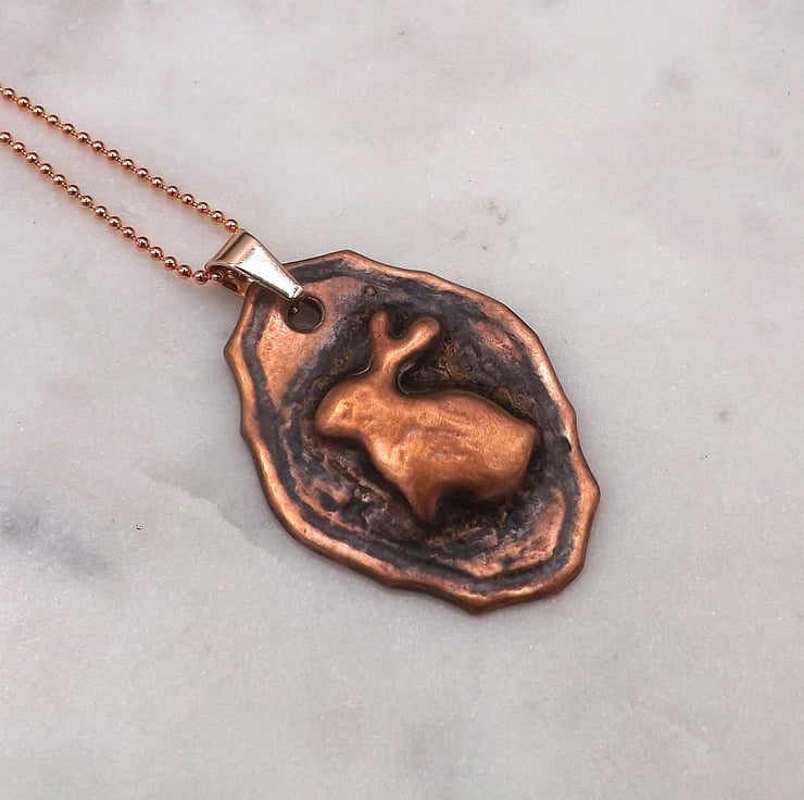 Recycled Copper Bunny Rabbit on Picture Frame Pendant Necklace.