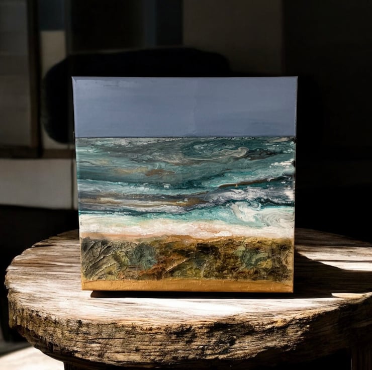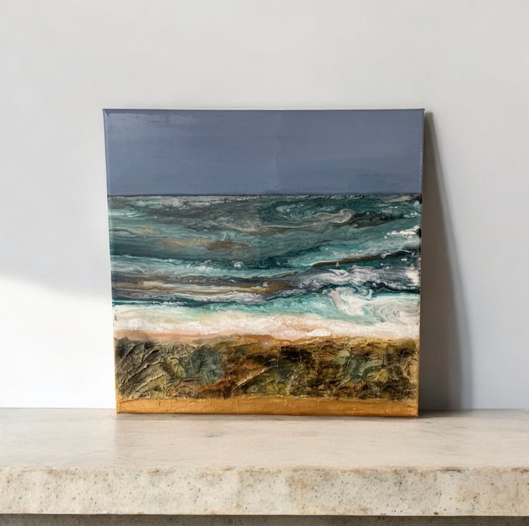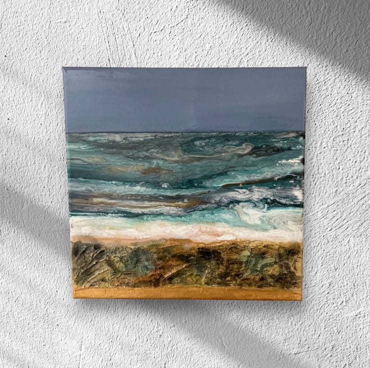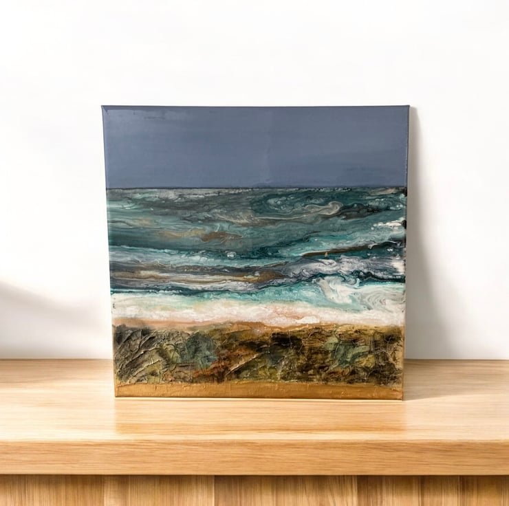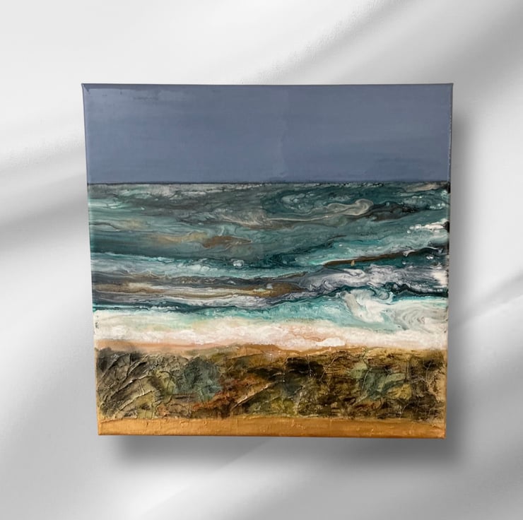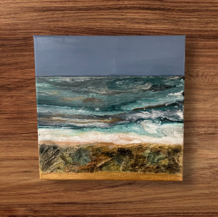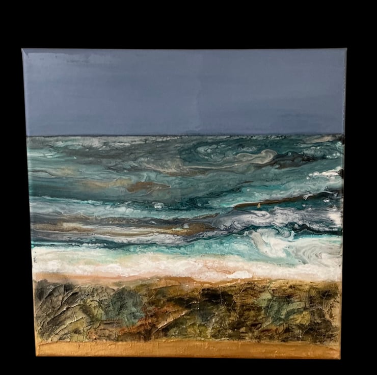 Abstract seascape and beach scene of Northumberland coast on a summers day , the sea is calm with shimmer and light dancing the sky is blue and the rocks in the foreground are textured so you can feel them . The painting is finished with a high gloss varnish and a Matt varnish on the rocks .