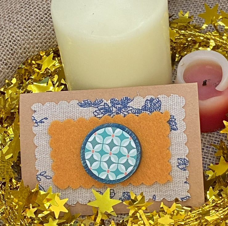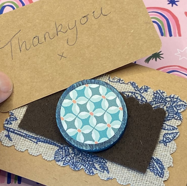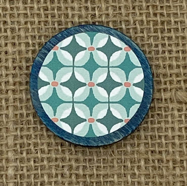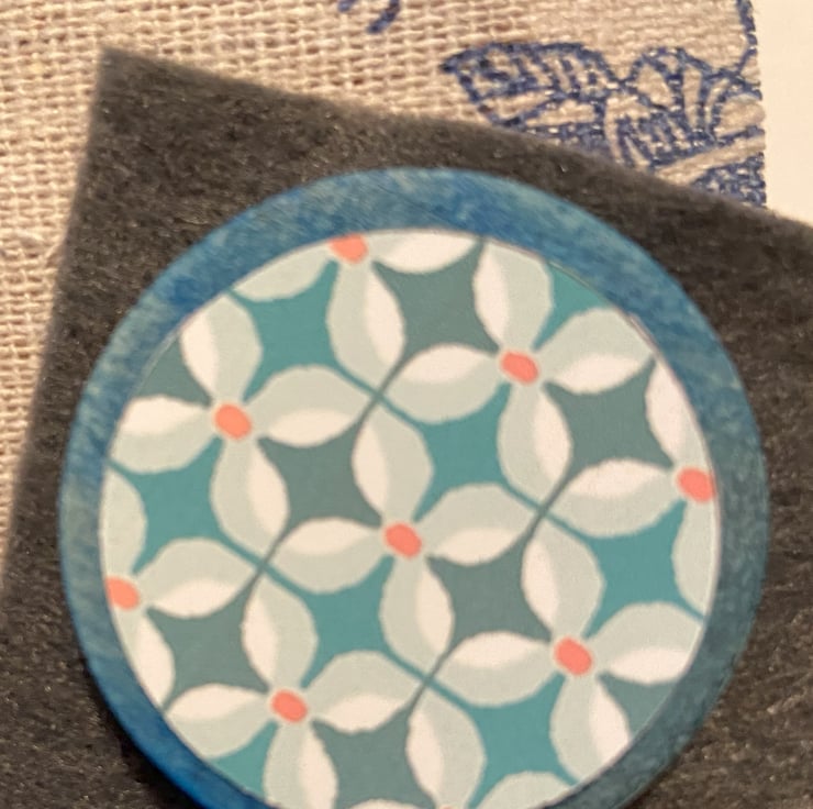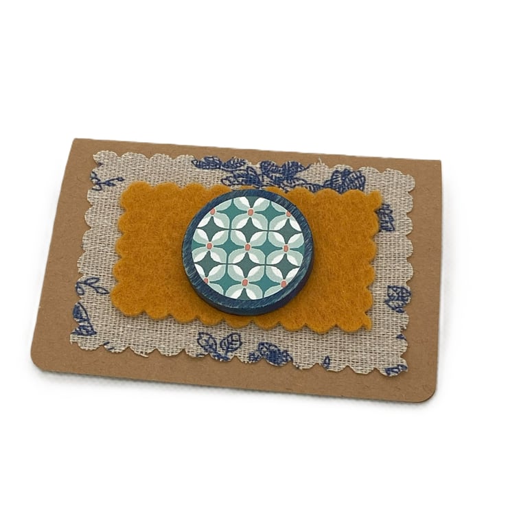 This is an eyecatching design with a pattern often seen in architecture. Everytime I see it - it makes me smile. I have used this motif many times just enjoying the variations that seem to keep coming. I love the orange and blue combination of colours. I printed the design onto a wooden transfer paper and hand painted the wooden disc with a blue water colour. I varnish it before and after placing the wood transfer. I also enjoy matching the fabric I use for the brooches display card. They sometimes do get mixed up!